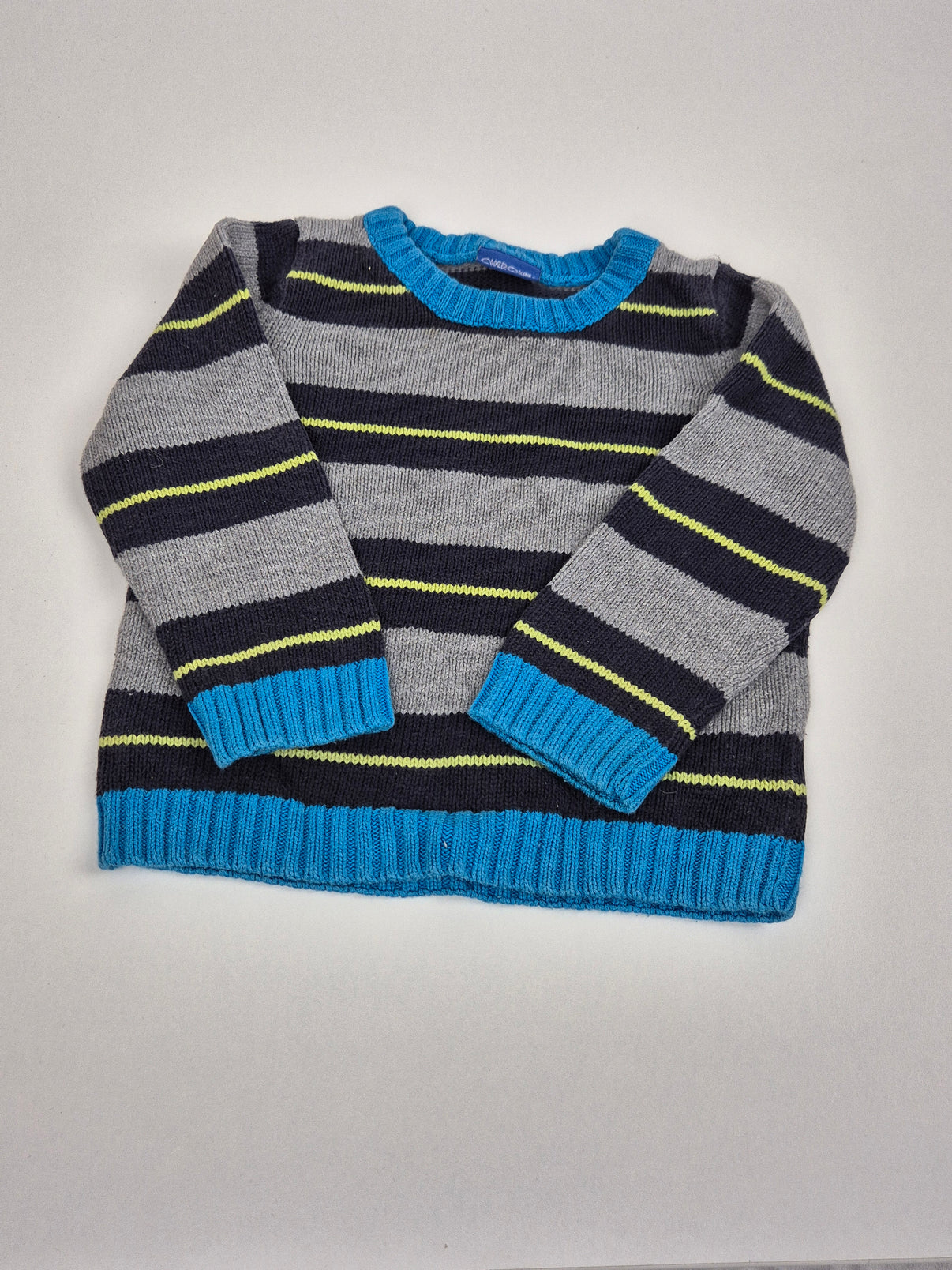 Pruhovaný dětský svetr značky Cherokee v kombinaci šedé, tmavě modré, světle modré a limetkové barvy. Vyrobený z příjemného, hřejivého úpletu, který krásně drží tvar a poskytuje pohodlí po celý den. Ideální na běžné nošení, do školky i na procházky v chladnějším počasí. Stylový pruhovaný vzor dělá z tohoto svetru oblíbený kousek pro kluka.