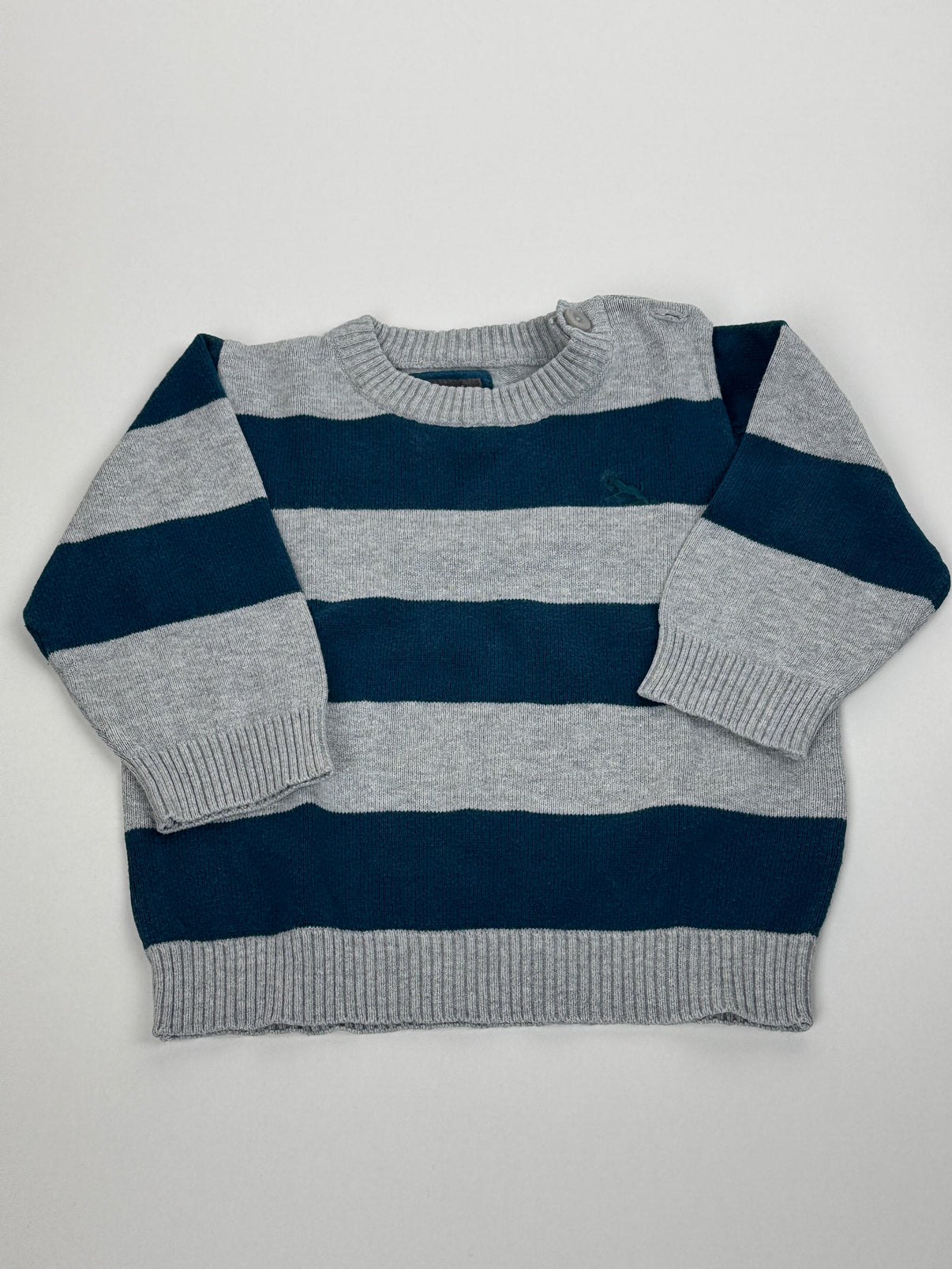 Pohodlný chlapecký svetr značky H&M ve velikosti 74 v klasickém pruhovaném designu v tmavě petrolejové a světle šedé barvě. Svetr je vyroben z měkkého úpletu, který příjemně hřeje a zároveň neškrábe. Praktické zapínání na rameni usnadňuje oblékání přes hlavu. Ideální kousek na každodenní nošení – do školky, na návštěvy i na vycházky. Stylový a univerzální svetr pro malé elegány.