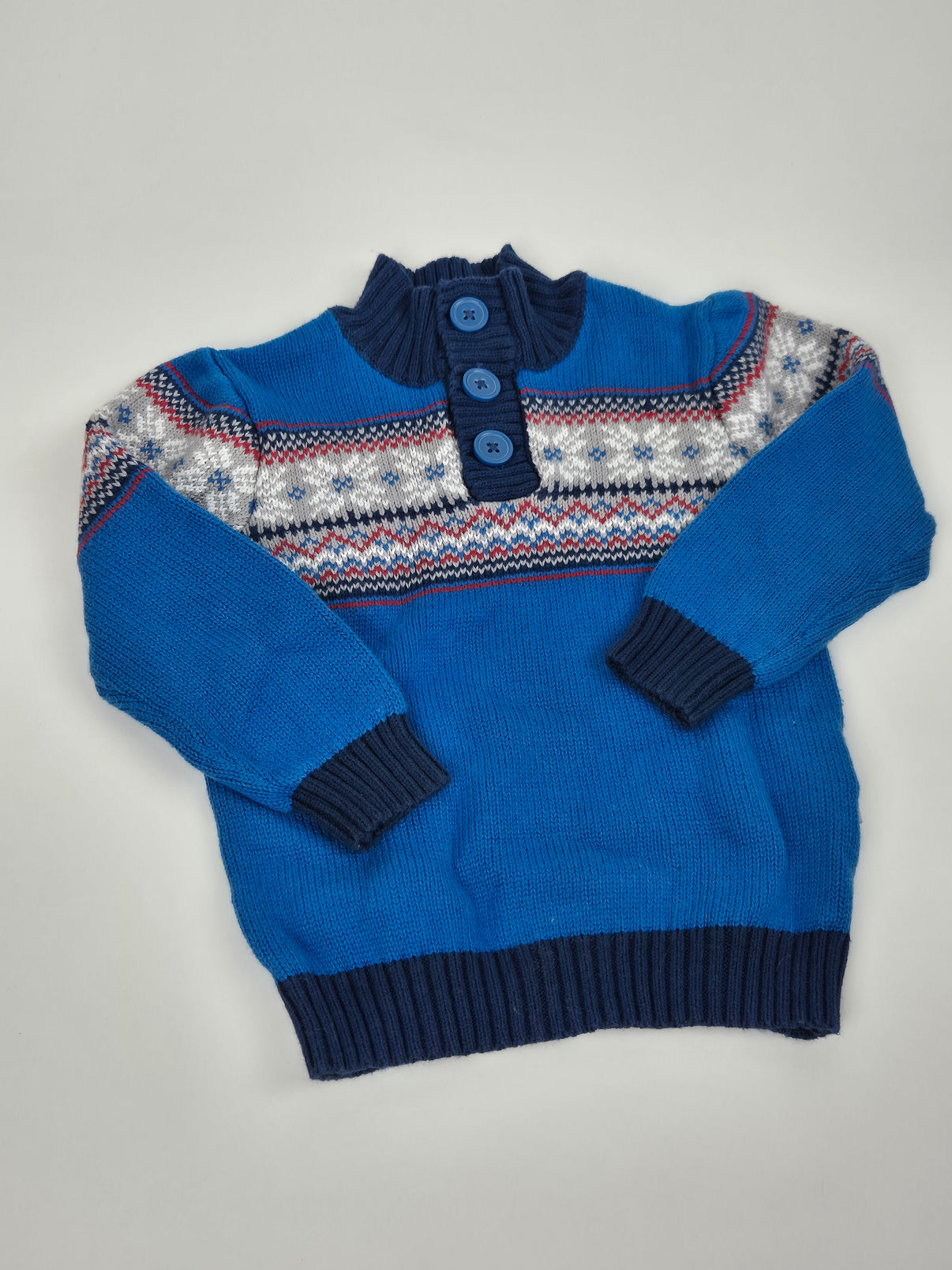 Krásný pletený svetr značky Liegelind ve velikosti 80. V sytě modré barvě s námořnickými detaily a norským vzorem v horní části působí hřejivě a elegantně. Praktické zapínání na tři velké knoflíky u krku usnadňuje oblékání a svlékání. Žebrované lemy na rukávech, spodním okraji i u krku zajišťují, že svetr dobře drží tvar a poskytuje pohodlí. Skvělý kousek na zimní a podzimní dny.