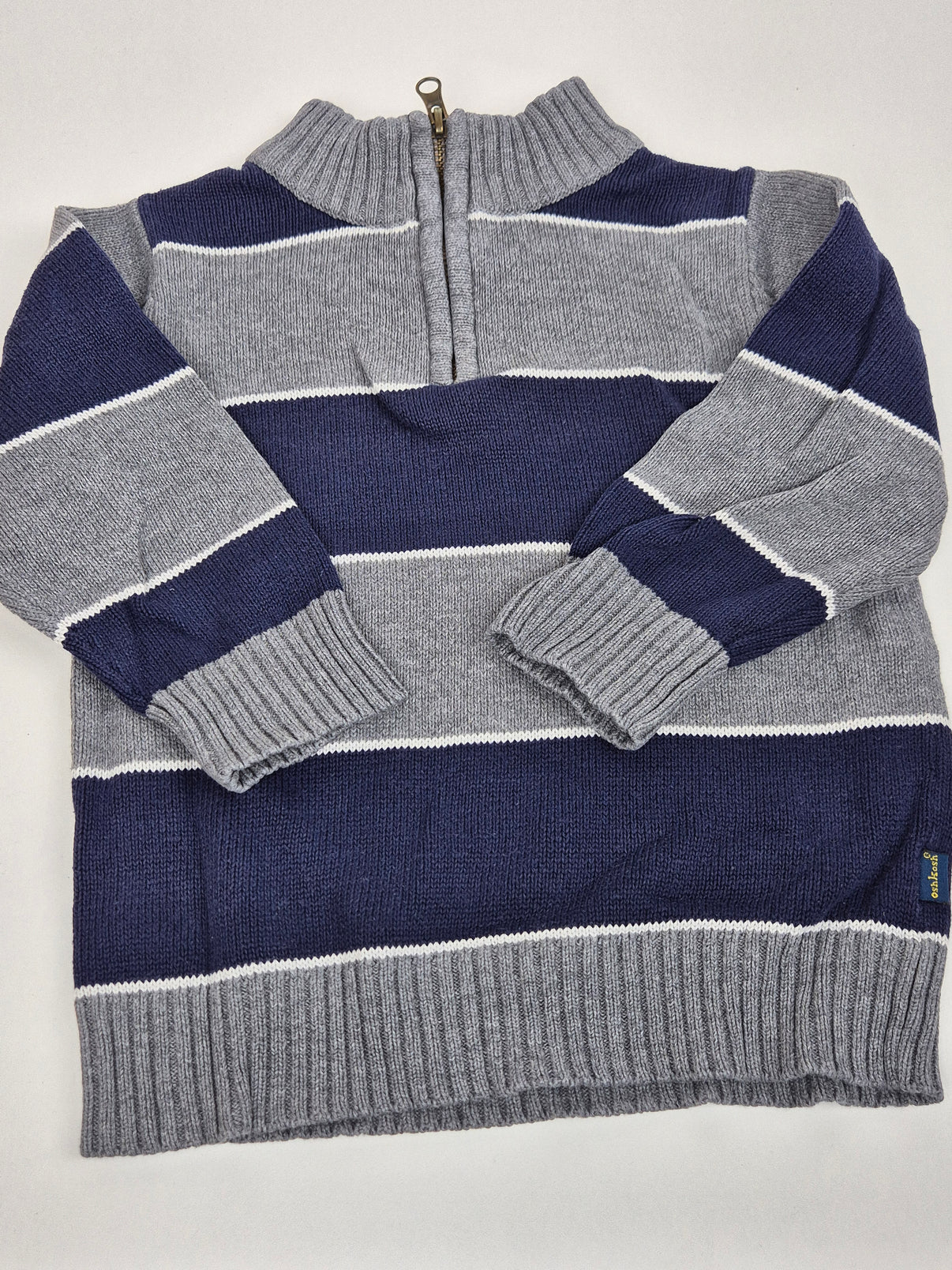 Příjemný pruhovaný svetr OshKosh v kombinaci tmavě modré, šedé a jemných bílých proužků. Má vyšší stojáček se zipem, takže krásně zahřeje a zároveň se snadno obléká. Žebrované lemy na rukávech i spodním okraji dobře drží tvar a příjemný úplet je ideální na chladnější dny. Skvělý kousek hlavně pro kluka, ale unisexově sedne i holčičímu šatníku.