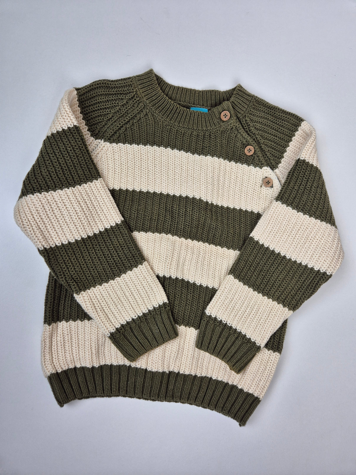 Pruhovaný pletený svetr Pepco v krásné kombinaci khaki zelené a krémové je hřejivý, měkký a ideální na chladnější dny. Široké pruhy působí moderně a díky knoflíkům u ramene se svetr snadno obléká i svléká. Žebrované lemy drží tvar a dodávají celému kousku hezké zakončení.
