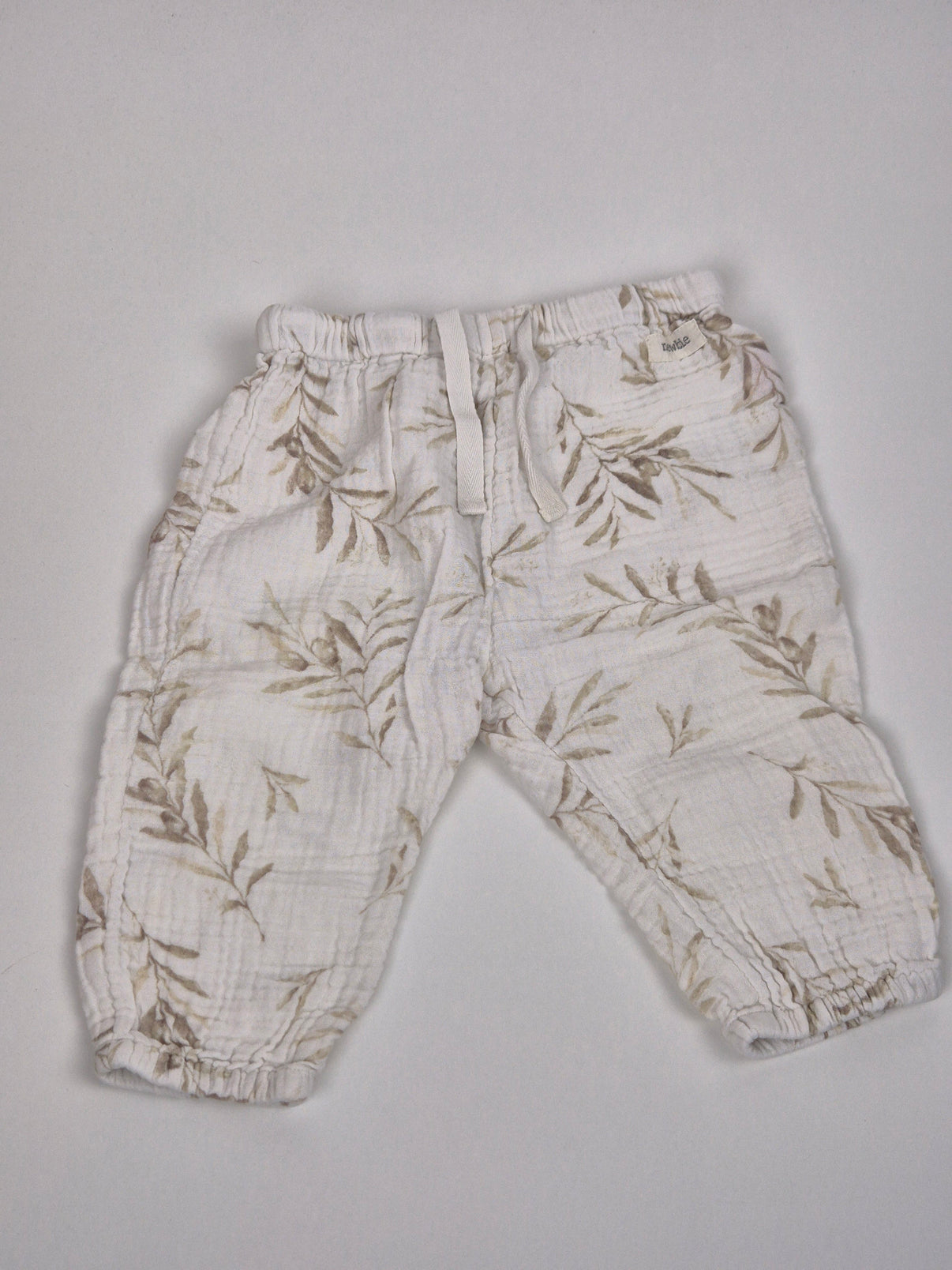 Lehké mušelínové kalhoty značky Newbie ve velikosti 74 jsou ideální volbou pro pohodlné nošení v teplejších dnech. Bílý podklad zdobí jemný rostlinný motiv v přírodních tónech, který působí velmi něžně...