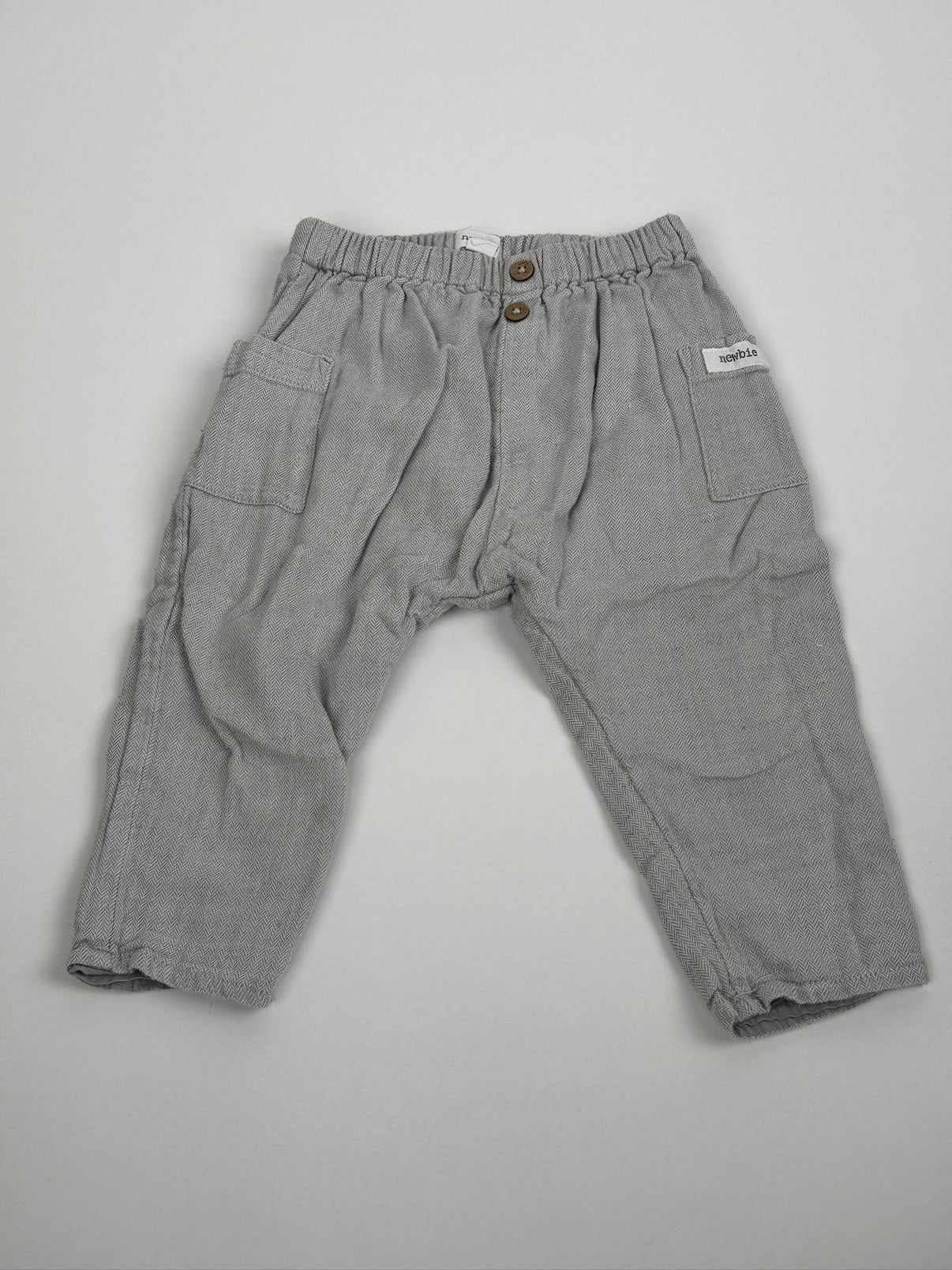 Stylové kalhoty značky Newbie ve velikosti 74 jsou ušité z příjemného materiálu s příměsí lnu, což z nich dělá ideální volbu na jaro a léto. Jemně šedý odstín s jemným vzorkem rybí kosti působí elegantně, ale zároveň zůstává univerzální – hodí se pro chlapečky i holčičky. Praktický elastický pas s knoflíčky zajistí pohodlné oblékání, kapsy přidávají na roztomilosti i funkčnosti. Perfektní na slavnostní události, návštěvy i běžné nošení ve stylu.