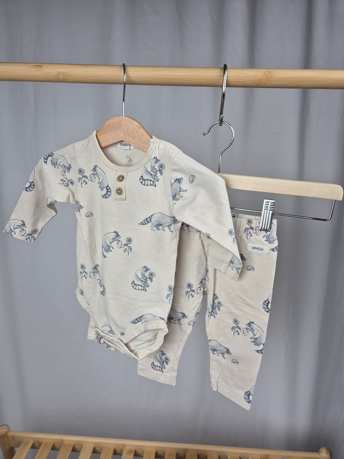 Roztomilý set značky Newbie ve velikosti 68 tvoří body s dlouhým rukávem a legínky v přírodním béžovém odstínu s jemným potiskem modrých mývalů a květin. Body má zapínání na patentky mezi nožičkami a knoflíčky u krku pro snadné oblékání. Legínky jsou z příjemného bavlněného materiálu s pružným pasem, který netlačí.