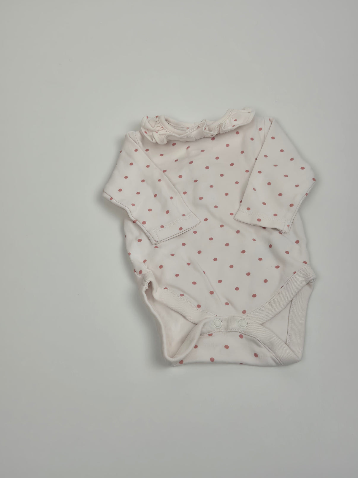 Body má dlouhý rukáv a jemně řasený límeček, který dodává kousku roztomilý a lehce slavnostní vzhled. Zapínání na druky v rozkroku usnadní přebalování, pohodlný střih je vhodný na každodenní nošení doma, do kočárku i na návštěvy. Díky jemnému designu je určeno především pro holčičku. Značka Next.