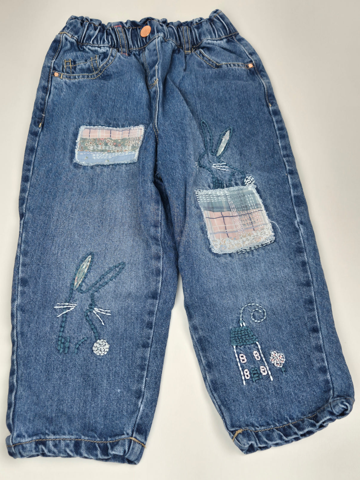 Roztomilé džíny Next ve velikosti 98 vynikají pohodlným volnějším střihem a krásnými aplikacemi, které jim dodávají jedinečný vzhled. Výšivky zajíčků, domečku a našité látkové záplaty působí hravě a originálně – ideální pro malé slečny, které rády nosí něco výjimečného.