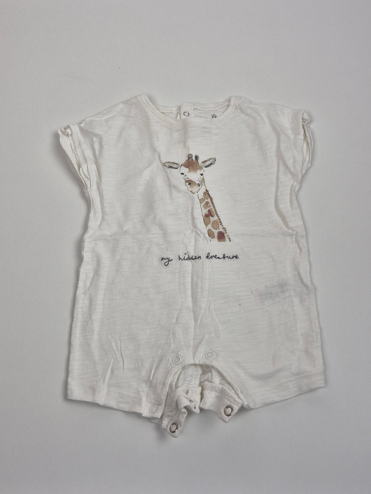 Lehký krémově bílý kraťasový overal s jemným mušelínovým vzhledem působí velmi něžně a vzdušně. Dominantou je roztomilý motiv žirafy v přírodních tónech, který dodává kousku klidný a nadčasový charakter. Krátké rukávy a nohavičky jsou ideální na teplejší dny, měkký a prodyšný materiál zajistí miminku maximální pohodlí. Praktické zapínání na patentky v rozkroku usnadní přebalování. Overal je vhodný jak pro holčičku, tak pro kluka.