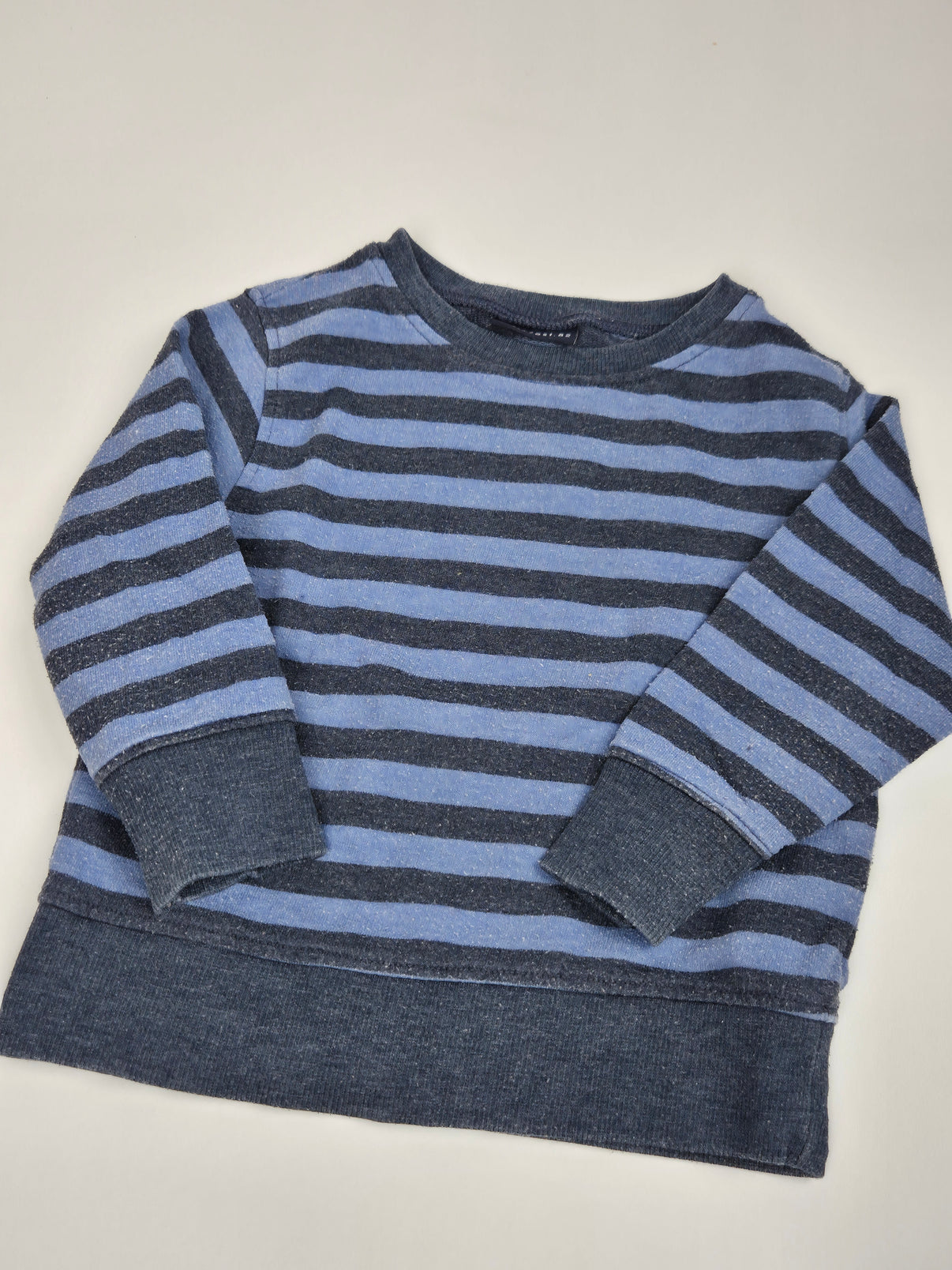 Pruhovaná mikina Next v odstínech modré a tmavě šedé – měkká, pohodlná a skvělá na každý den. Ideální jako lehčí vrstva do školky, na doma nebo ven. Má pružné lemy na rukávech i v pase, takže hezky drží tvar a dobře se nosí.