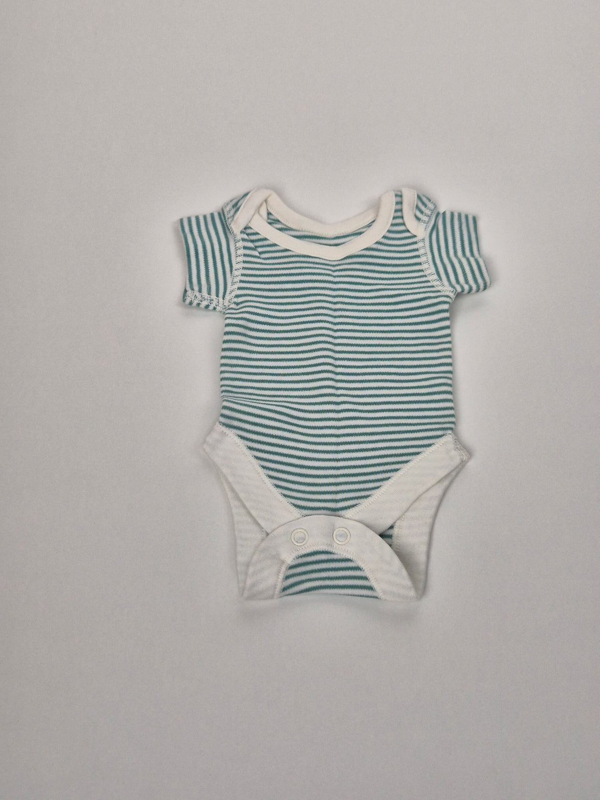 Body s krátkým rukávem značky Marks & Spencer ve velikosti 45 je ideální pro drobnější miminko, například pro nedonošené děti. Je v elegantním pruhovaném provedení v bílé a tmavě zelenomodré barvě, doplněné kontrastním lemováním. Praktické zapínání mezi nožičkami usnadňuje přebalování.