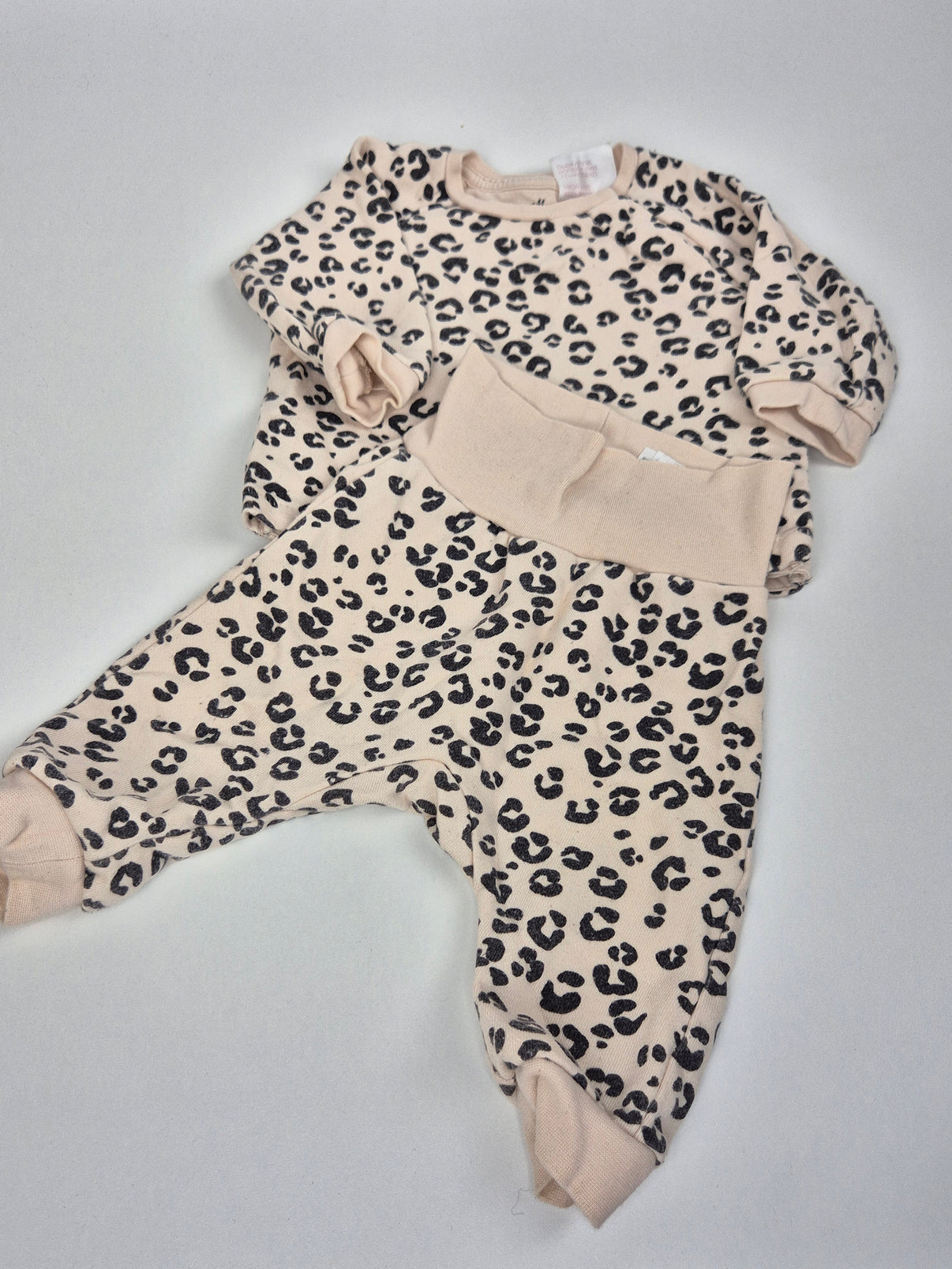 Stylová lehká tepláková souprava H&M ve velikosti 62 v béžové barvě s černým leopardím vzorem. Souprava se skládá z mikinky s dlouhým rukávem a tepláčků s vysokým pružným pasem a zakončením s nohavičkami. Vyrobena z měkké, prodyšné bavlny pro maximální pohodlí – ideální na běžné nošení, hraní i cestování.