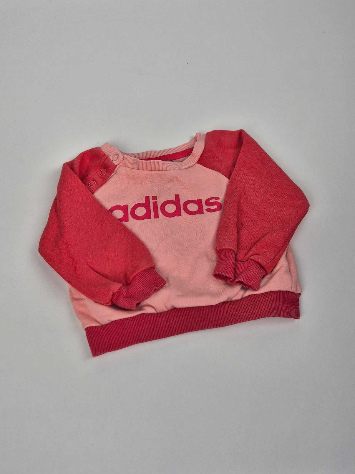 Sportovní mikina Adidas ve velikosti 62 v kombinaci světle a tmavě růžové barvy s typickým logem značky na přední straně. Mikina má zapínání na rameni na patentky, pružné lemy na rukávech i spodním okraji a je vyrobena z měkké bavlny s příměsí pro pohodlné nošení. Skvělá volba pro malé aktivní slečny – ideální na procházky i do kočárku.