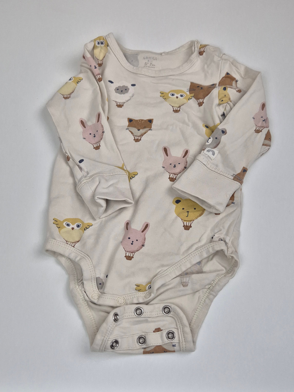 Měkké prodlužovací body od Lindex v jemném krémovém odstínu, zdobené roztomilými zvířecími motivy v pastelových barvách. Dlouhý rukáv a pohodlné zapínání na cvočky mezi nožičkami i na ramínku usnadní oblékání i přebalování.