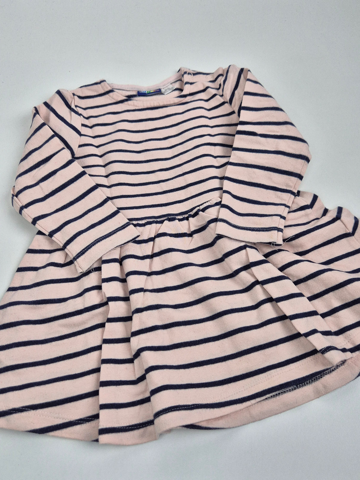 Roztomilé bavlněné šatičky v jemně pudrové růžové barvě s tmavě modrými proužky – krásná kombinace, která se hodí na každodenní nošení i na hezčí příležitosti. Dlouhé rukávy a měkký materiál zajišťují pohodlí po celý den. Přestřižení v pase vytváří lehce rozšířenou sukýnku, která při pohybu hezky vlaje. Ideální pro holčičku.