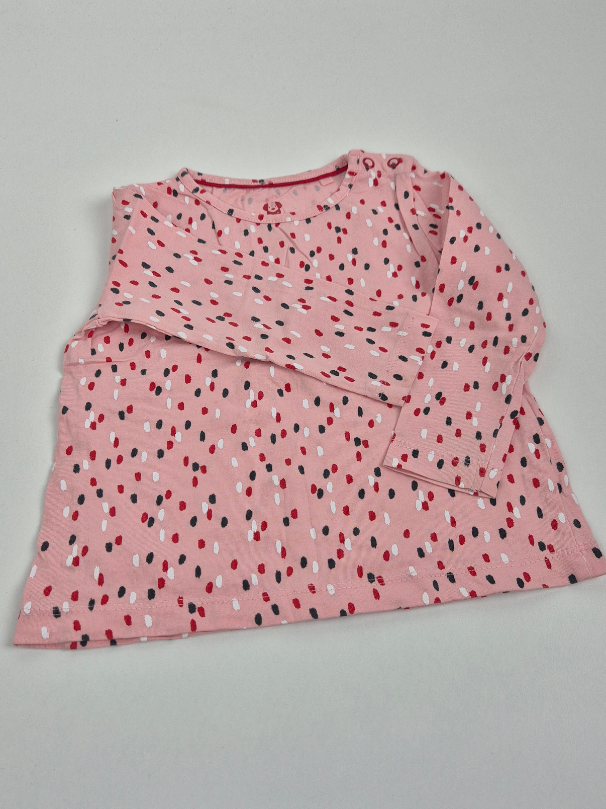 Jemné růžové tričko s dlouhým rukávem zdobené drobným puntíkovým vzorem v odstínech červené, bílé a tmavě modré. Příjemná bavlna je ideální na každodenní nošení do školky i na doma. Zapínání na rameni usnadňuje oblékání a pohodlný střih dopřeje holčičce volnost pohybu po celý den.