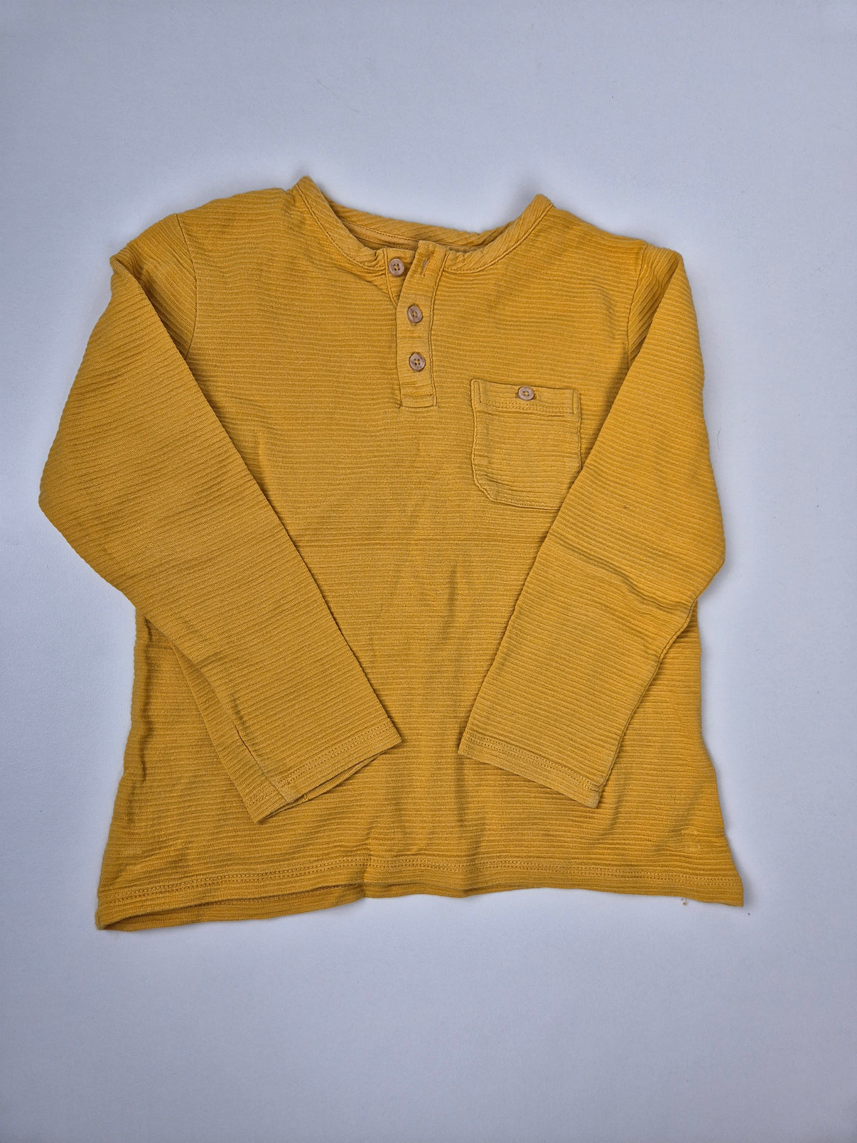 Zářivě hořčicové tričko Pepco s dlouhým rukávem a žebrovanou strukturou je skvělým celoročním kouskem. Henley zapínání na tři knoflíčky působí stylově a nechybí ani malá náprsní kapsa. Příjemný, měkký materiál se hodí do školy, na běžné nošení i jako lehčí vrstva na chladnější dny.