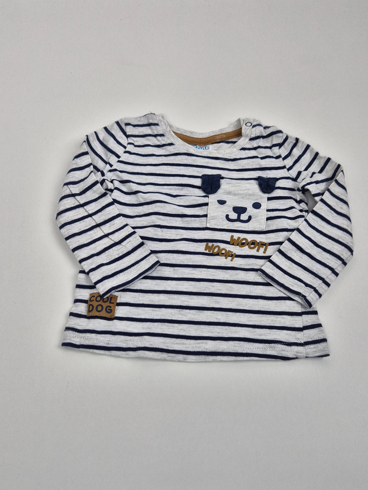 Pruhované tričko v bílé a tmavě modré barvě s dlouhým rukávem a roztomilým motivem pejska na kapsičce. Výšivka „WOOF!“ a malé našité uši dodávají kousku hravý vzhled. Příjemná bavlna je ideální na každodenní nošení do školky i na doma. Zapínání na rameni usnadňuje oblékání. Skvělé pro chlapečka.