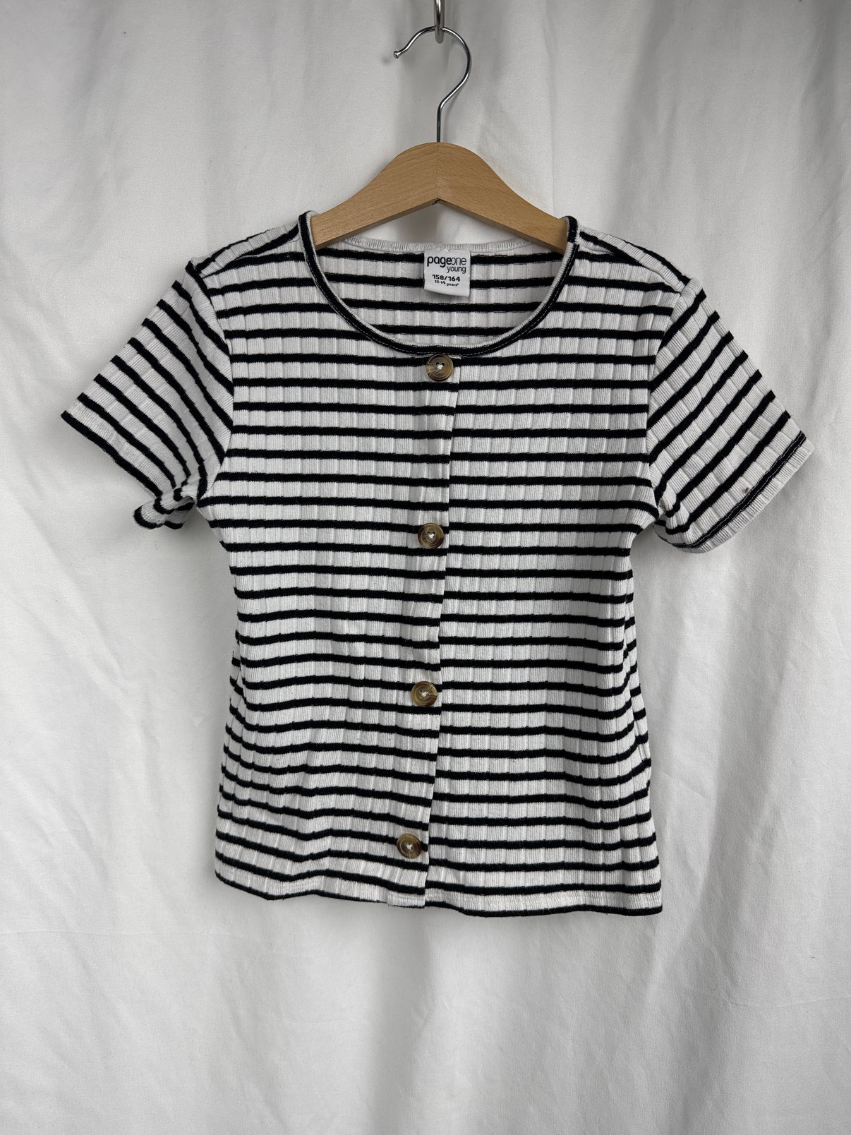 Stylové dívčí tričko Takko ve velikosti 158/164 v černo-bílém proužkovaném designu. Žebrovaný materiál pěkně sedí na postavě a dekorativní knoflíky na přední straně dodávají triku moderní, lehce elegantní vzhled. Ideální do školy, na volný čas i jako univerzální kousek k džínám nebo sukni.