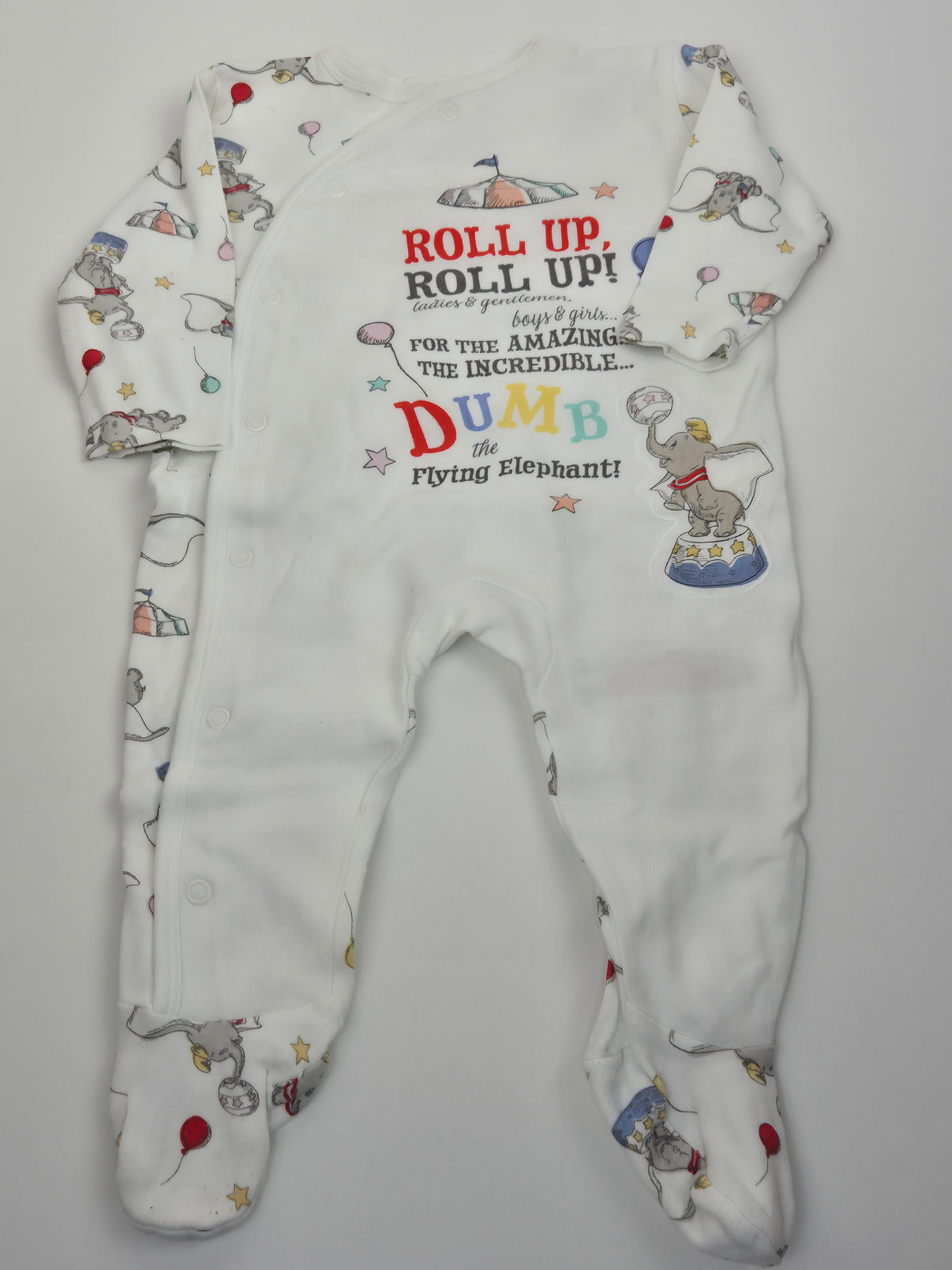 Roztomilé dupačky v čistě bílé barvě s pohádkovým motivem slůněte Dumbo. Jemný celoplošný potisk s balónky, hvězdičkami a cirkusovými detaily je doplněný barevným nápisem na přední straně v odstínech červené, modré, žluté a šedé. Celkový vzhled působí hravě, ale zároveň velmi něžně.