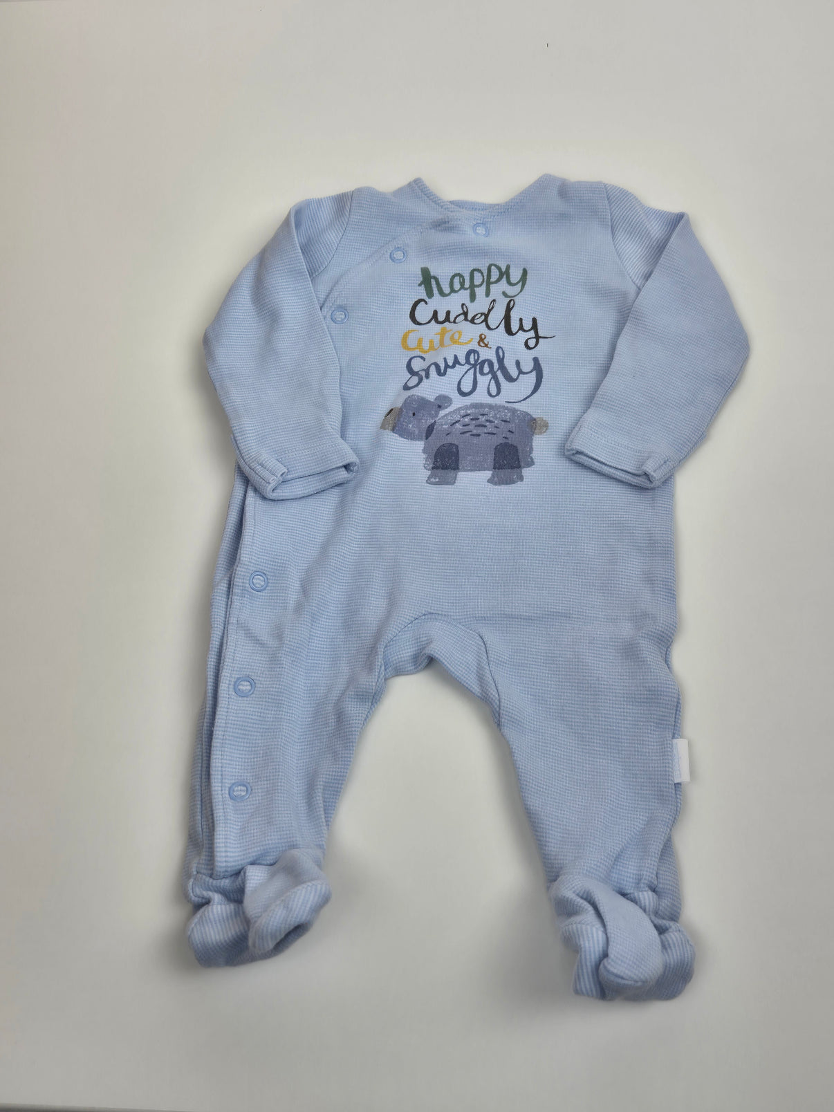 Světle modré dupačky z jemného, příjemného materiálu jsou jako stvořené pro první týdny miminka. Hebká struktura látky je šetrná k citlivé pokožce a zajistí pohodlí po celý den i noc. Roztomilý potisk se slůnětem a nápisem Happy, Cuddly, Cute & Snuggly dodává kousku hravý a milý vzhled. Praktické zapínání na druky po celé délce usnadní přebalování. Skvělá volba pro kluka, ale díky jemné barvě klidně i jako univerzální kousek.