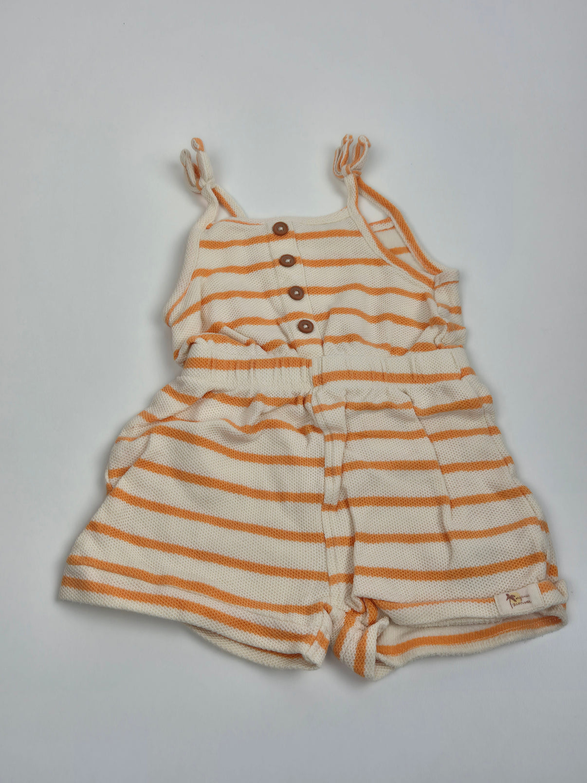 Lehký letní overal v přírodním krémovém odstínu s jemnými oranžovými proužky je ideální na teplé dny. Příjemný bavlněný materiál s jemnou strukturou je prodyšný a pohodlný i pro celodenní nošení. Ramínka na zavazování umožní lehké přizpůsobení, knoflíčky na přední straně usnadní oblékání a kraťasový střih dopřeje volnost pohybu při objevování světa. Stylový kousek na léto – doma, na hřiště i na výlety.
