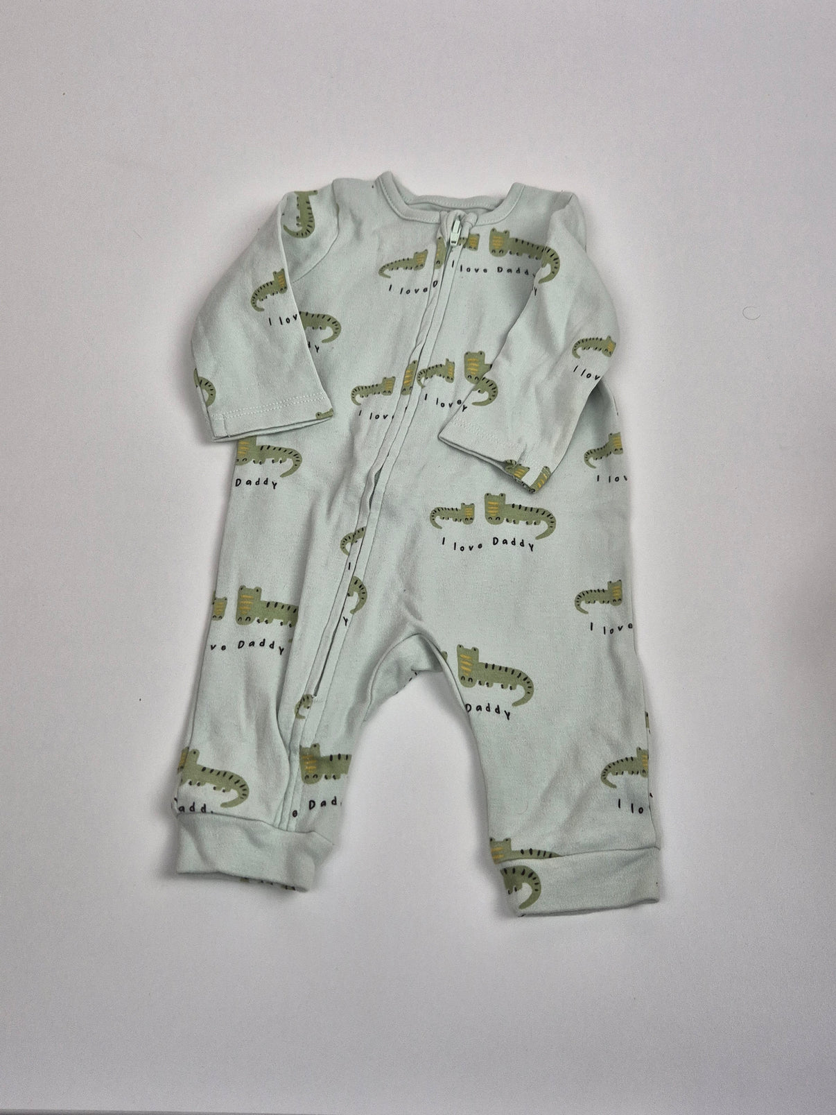 Roztomilý overal pro miminko v jemném mentolově zeleném odstínu, který působí svěže a klidně. Celoplošný potisk malých krokodýlků s nápisem „I love daddy“ dodává overálku hravý a milý charakter. Praktické zapínání na zip po celé délce usnadní oblékání i přebalování, zakončení nohavic i rukávků je pohodlné a příjemné. Měkký bavlněný materiál je ideální pro nejmenší – na spaní, na doma i jako součást první výbavičky.