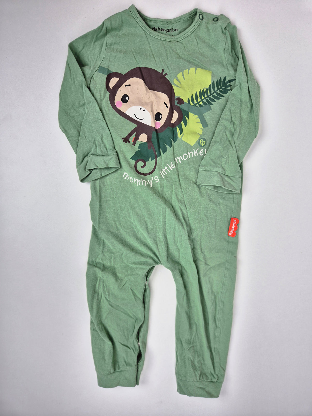 Pohodlný dětský overal Fisher-Price (Sinsay) v jemné zelené barvě s roztomilým potiskem opičky a nápisem „Mommy’s little monkey“. Vyrobený z měkké, prodyšné bavlny, která je šetrná k dětské pokožce. Overal má dlouhé rukávy i nohavice a praktické zapínání na druky mezi nohavicemi i u ramene, takže se snadno obléká. Ideální na spaní i domácí hraní. Vhodný pro holčičku i chlapečka.