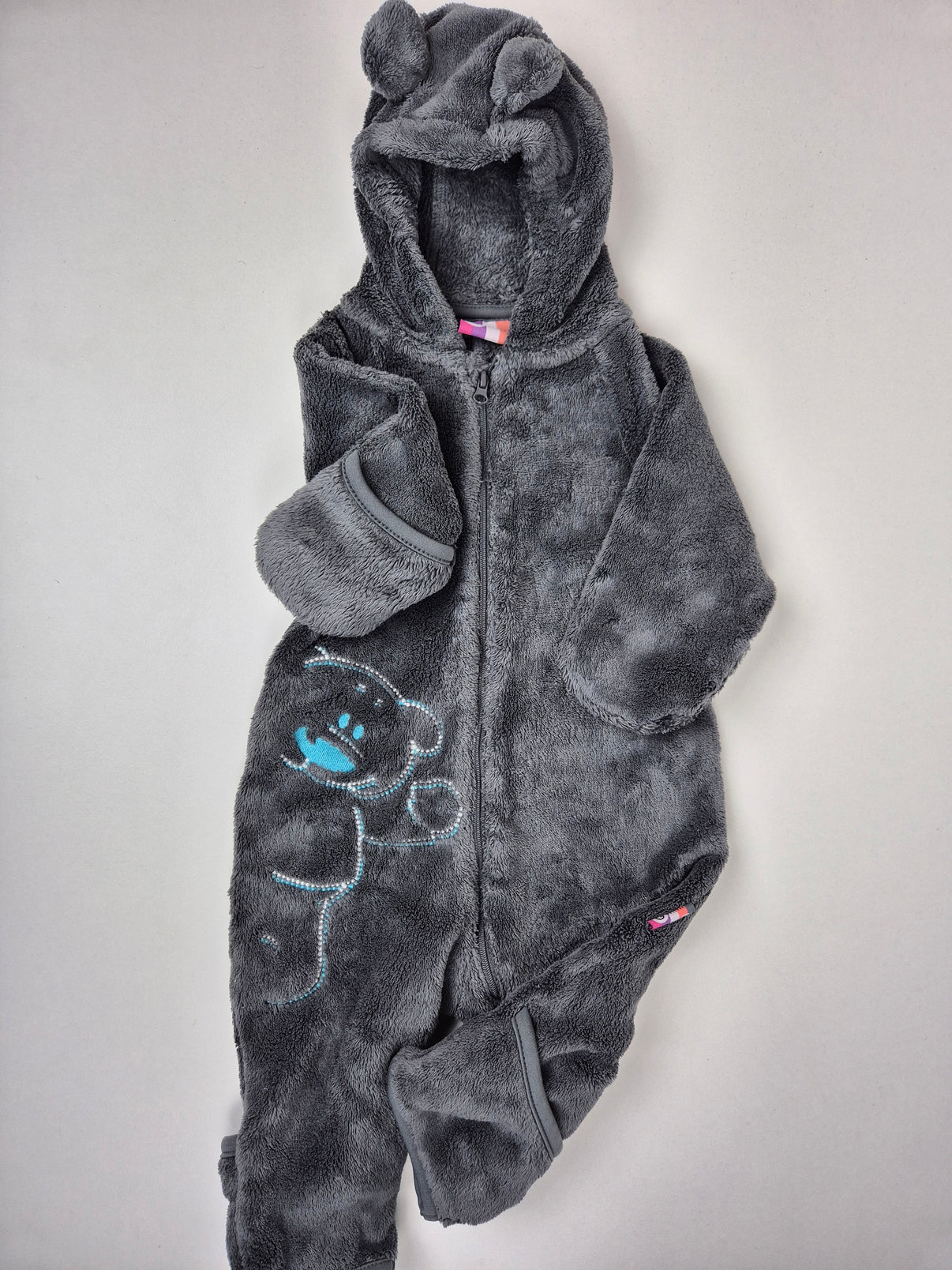 Měkoučký hřejivý overal G-mini ve tmavě šedé barvě z hebkého fleecu – ideální na chladné dny i do kočárku. Roztomilá kapuce s oušky dodává hravý vzhled a výšivka medvídka na přední straně celý kousek krásně oživí. Praktický zip po celé délce usnadní oblékání i svlékání. Skvělý univerzální kousek pro holku i kluka.