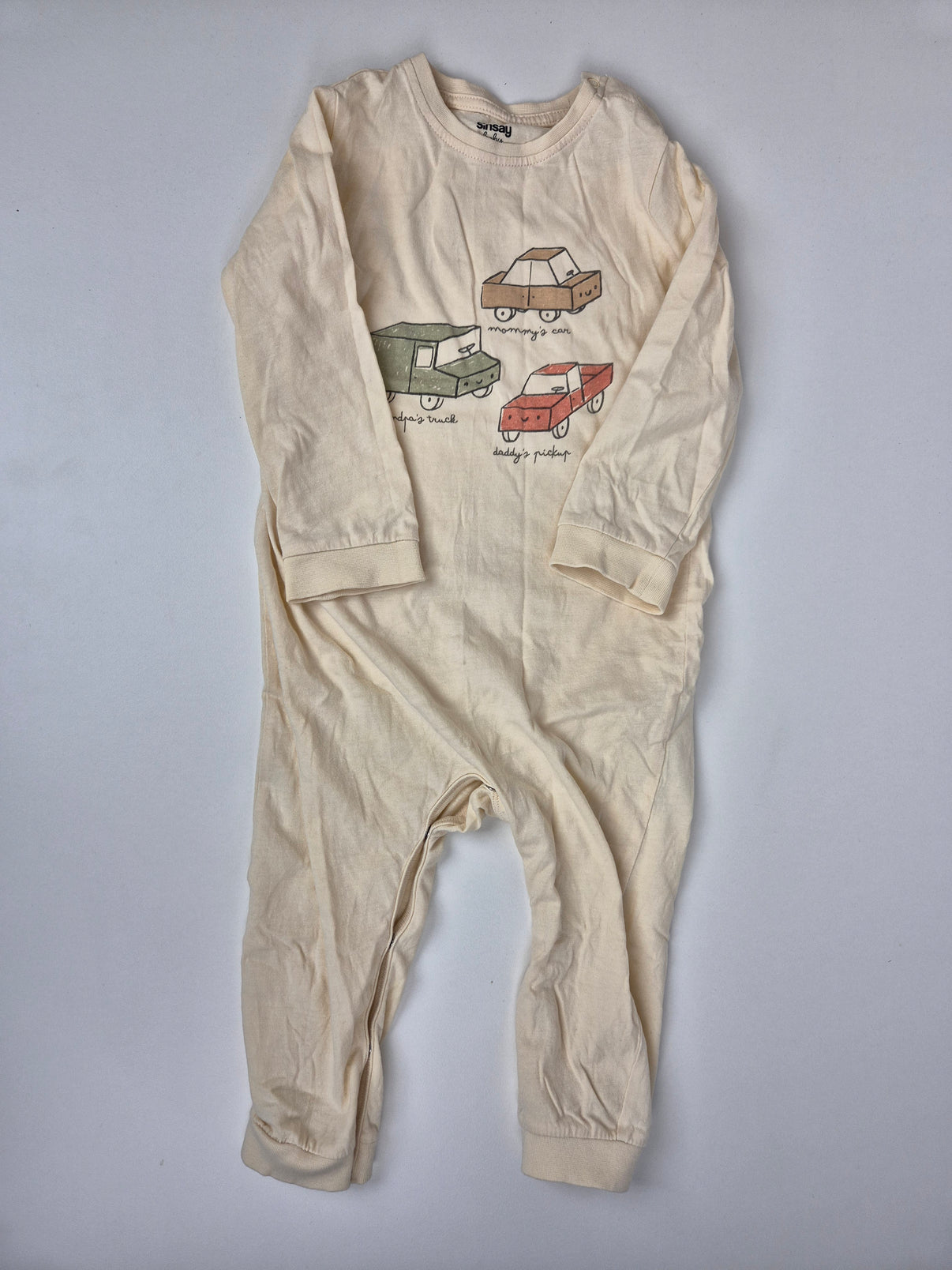 Měkoučký bavlněný overal Sinsay ve velikosti 92 v jemně krémové barvě s roztomilým potiskem autíček mommy’s car, daddy’s truck, daddy’s pickup. Ideální na spaní i domácí pohodu. Díky pružným manžetám na rukávech i nohavicích pěkně drží tvar a nikde netáhne. Lehký, prodyšný materiál zajistí pohodlí po celý den i noc.