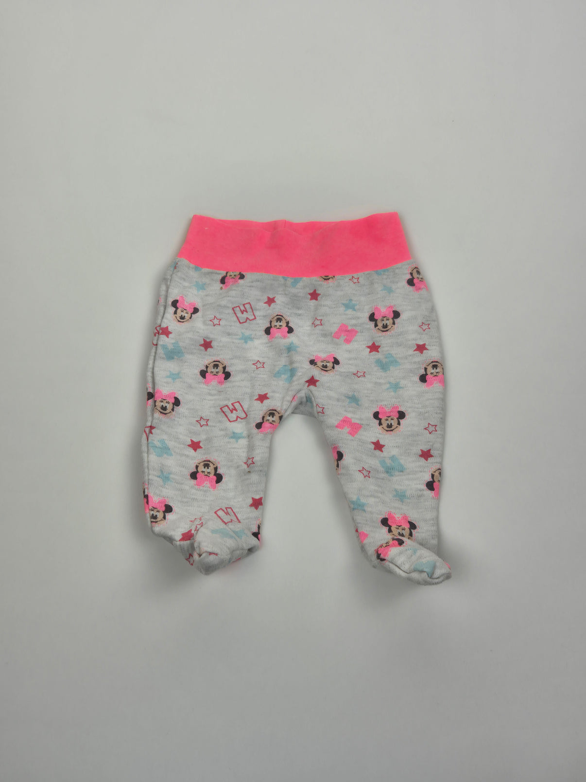 Roztomilé polodupačky v šedém melíru s oblíbeným motivem Minnie Mouse, doplněné hvězdičkami a písmenky v růžových a pastelových tónech. Výrazný růžový pas je měkký, pružný a pohodlný na bříško, kryté nožičky udrží miminko v teple bez nutnosti ponožek. Příjemný bavlněný materiál je šetrný k citlivé dětské pokožce. Ideální kousek na každodenní nošení doma i do kočárku. Vhodné především pro holčičku.
