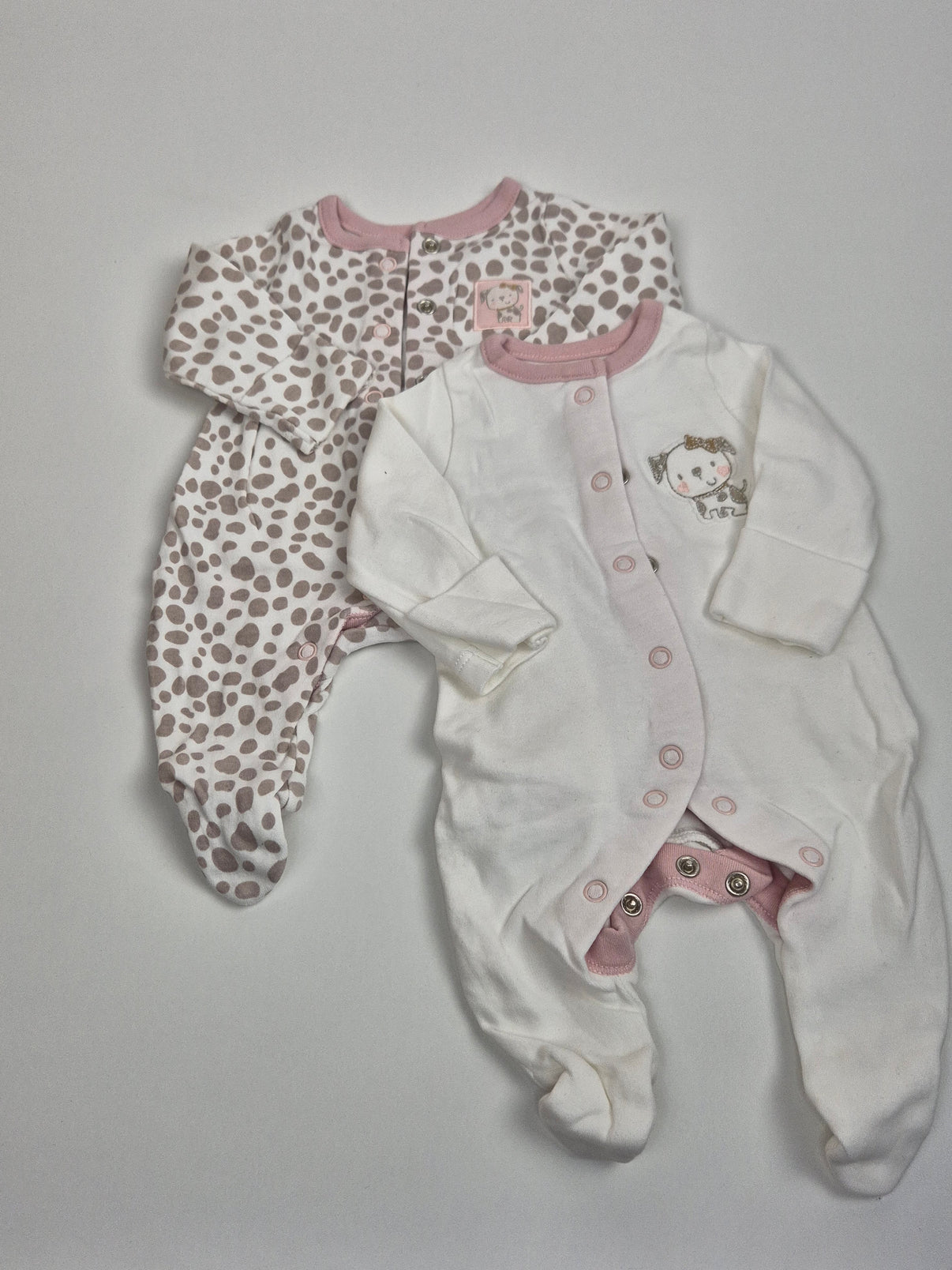 Něžná sada dvou dupaček v jemných krémovo-růžových tónech je ideální volbou pro úplně nejmenší miminko. Jedny dupačky zdobí decentní puntíkový vzor v teplém béžovém odstínu, druhé jsou jednobarevné s roztomilým motivem pejska na hrudi. Kombinace bílé, béžové a pudrově růžové působí velmi jemně a čistě. Praktické zapínání na patentky po celé délce i mezi nožičkami usnadní přebalování, uzavřené nožičky zajistí miminku teplo a pohodlí. Měkký materiál je vhodný na každodenní nošení i spaní.