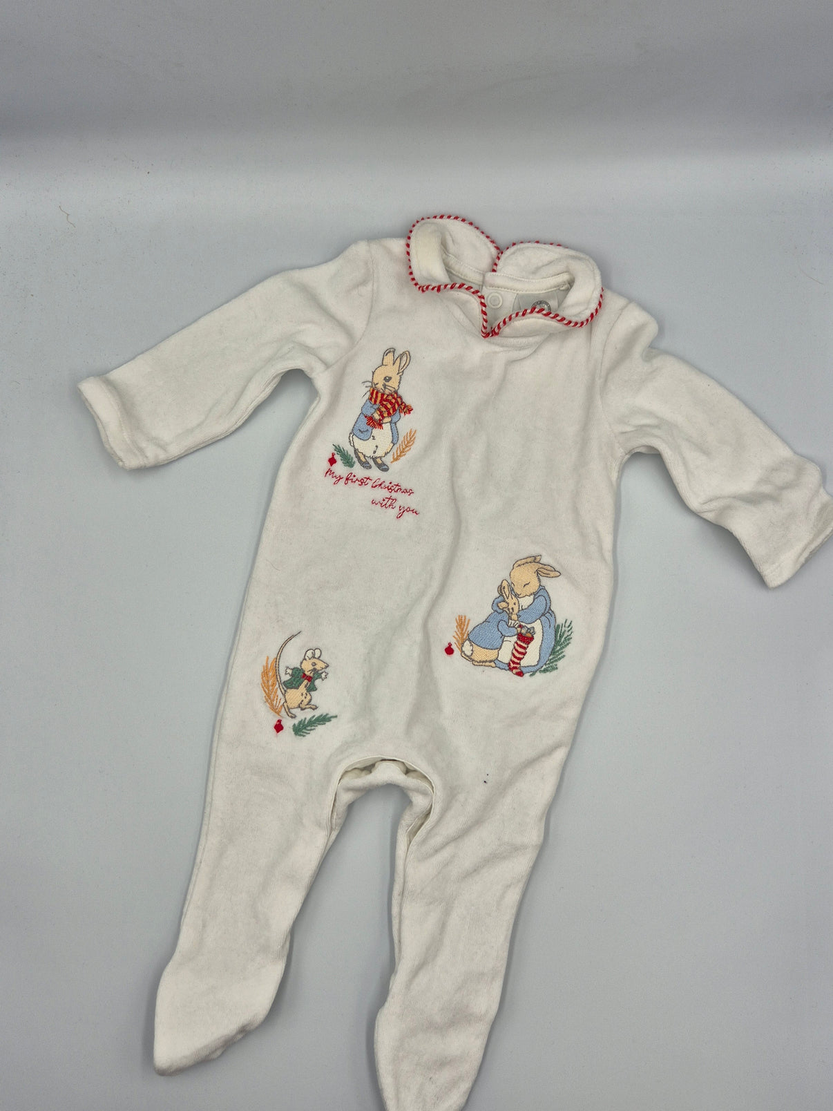 Přední část zdobí krásné výšivky postaviček Peter Rabbit a dalších zvířátek doplněné jemnými zimními detaily. Nechybí ani nápis „My first Christmas with you“, který z nich dělá perfektní kousek na první Vánoce miminka nebo na sváteční focení.