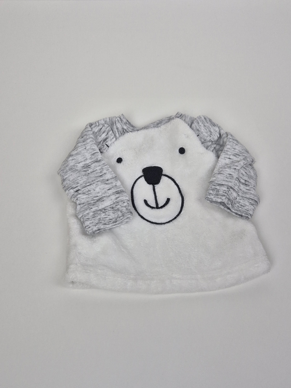 Roztomilá plyšová mikina F&F ve velikosti 56, ideální pro novorozence. Bílá mikina s šedými rukávy a výšivkou medvídka na přední straně působí velmi mile a hebce. Vyrobená z měkkého, hřejivého materiálu, který je příjemný k dětské pokožce.