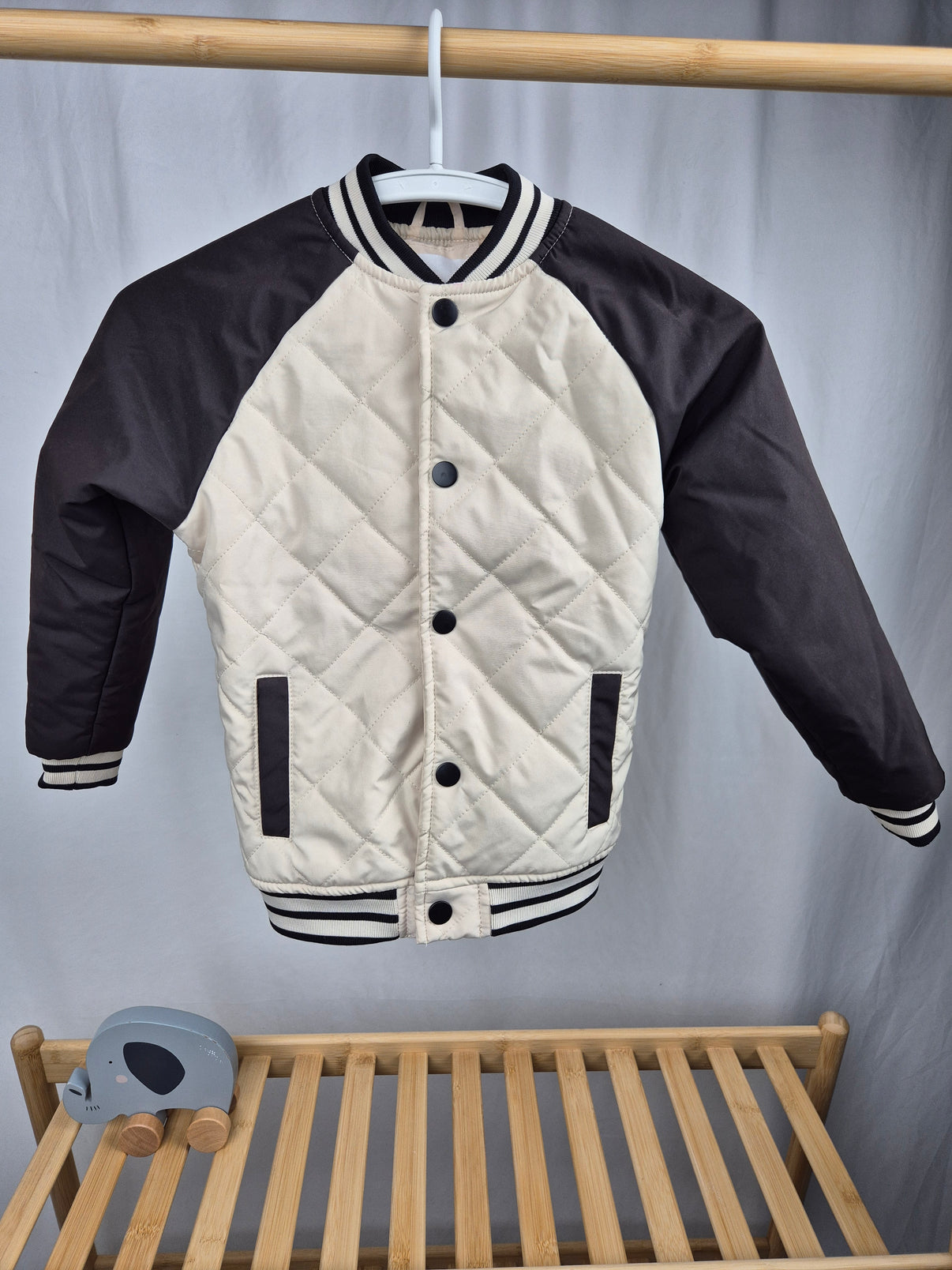 Stylová prošívaná bunda Sinsay v kombinaci krémové a černé barvy s kontrastními pruhy na límci, rukávech a spodním lemu. Připomíná oblíbený „college“ styl, takže se hodí jak do školy, tak na běžné nošení. Lehká, ale hřejivá – ideální na podzim či jaro. Zapínání na patentky a dvě praktické kapsy.