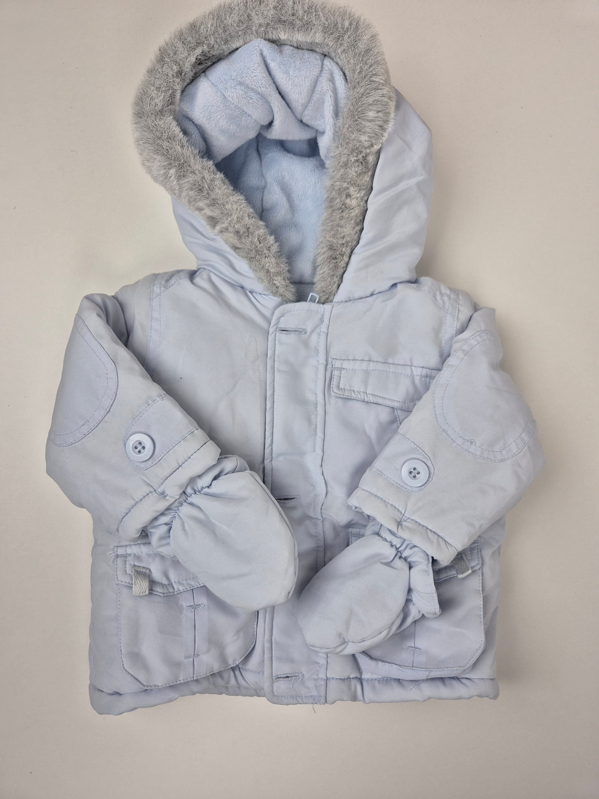 Hřejivá zimní bunda Mothercare v jemné světle modré barvě je ideální do chladných dnů. Uvnitř je měkký, plyšový fleece a kapuce má nádherný chlupatý lem, který krásně zahřeje. Součástí jsou také připínací rukavičky, díky kterým budou malé ručky v teple i ve větru. Praktické zapínání na zip s légou na druky a pohodlný střih dělají z této bundičky skvělou volbu na zimu pro chlapečka.