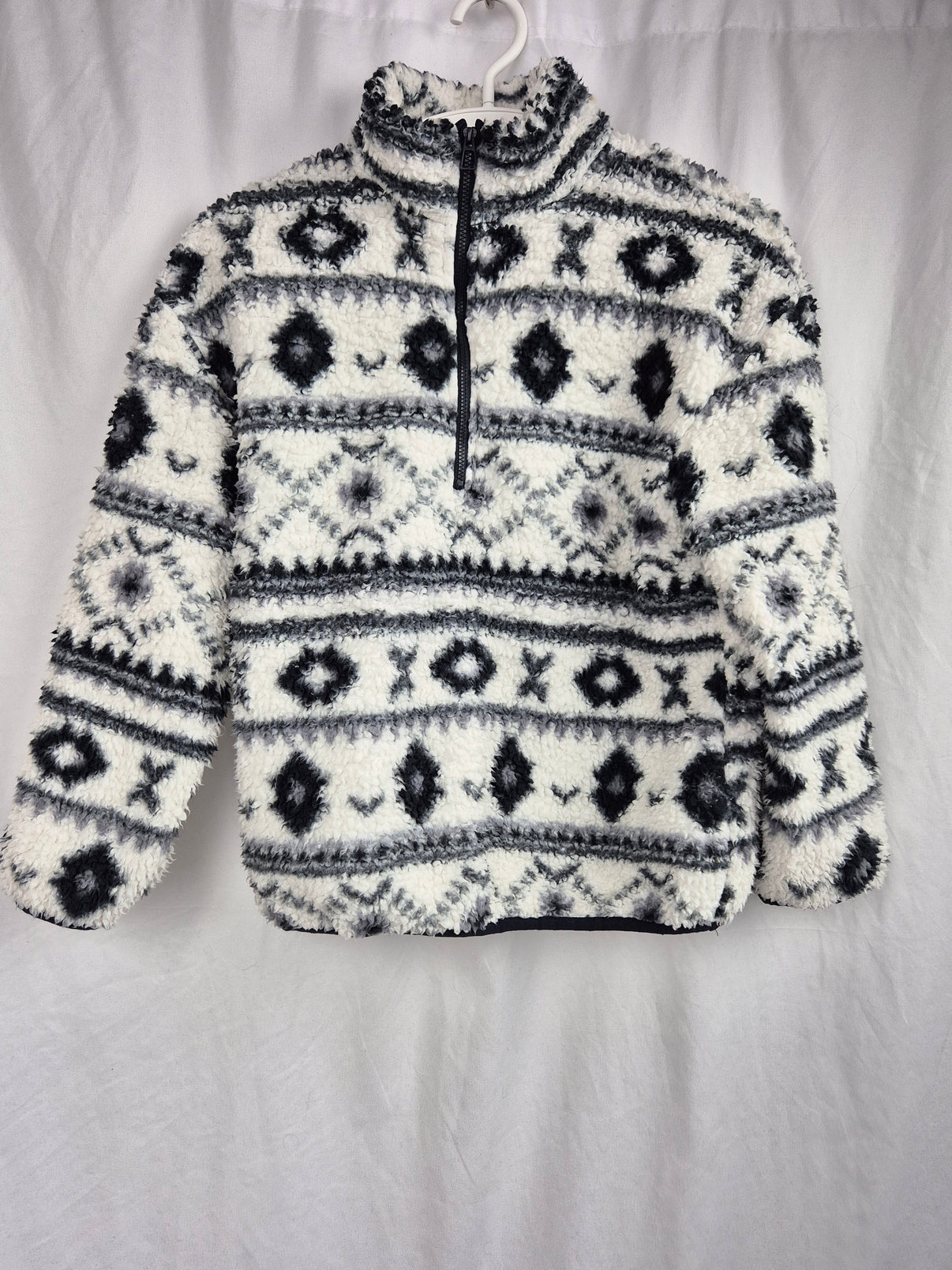 Měkoučká fleecová mikina Destination v bílo-černém provedení s geometrickým vzorem. Teplý chlupatý materiál krásně hřeje a zip u krku umožňuje snadné oblékání. Ideální volba do chladných dnů – do školy, na výlety nebo jen tak na doma.