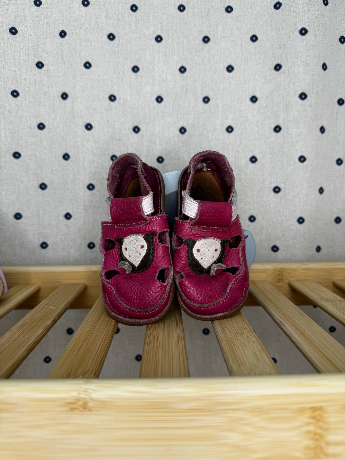Roztomilé barefoot kožené sandály značky Tikky ve velikosti 24. Tyto sandály mají tmavě růžovou barvu a jsou ozdobeny motivem roztomilých pand na přední straně. Jsou vyrobeny z měkké a kvalitní kůže, která zajišťuje pohodlí a podporu pro dětská chodidla. Sandály mají praktické zapínání na suchý zip, což umožňuje snadné obouvání a vyzouvání. Ideální volba pro malé holčičky na teplé letní dny, na procházky nebo na hřiště. Tyto sandály dodají každému outfitu hravý a stylový vzhled.