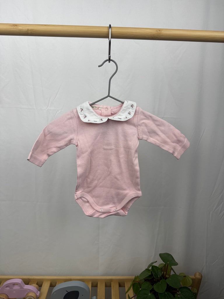 Roztomilé růžové body s dlouhým rukávem a jemným bílým límečkem ozdobeným drobným květinovým vzorem. Díky jemné pastelové barvě je ideální pro malé holčičky. Zapínání na cvočky usnadňuje oblékání a přebalování. Stylový kousek od značky United Colors of Benetton, který je nejen praktický, ale i elegantní – perfektní volba na každodenní nošení i slavnostní příležitosti.