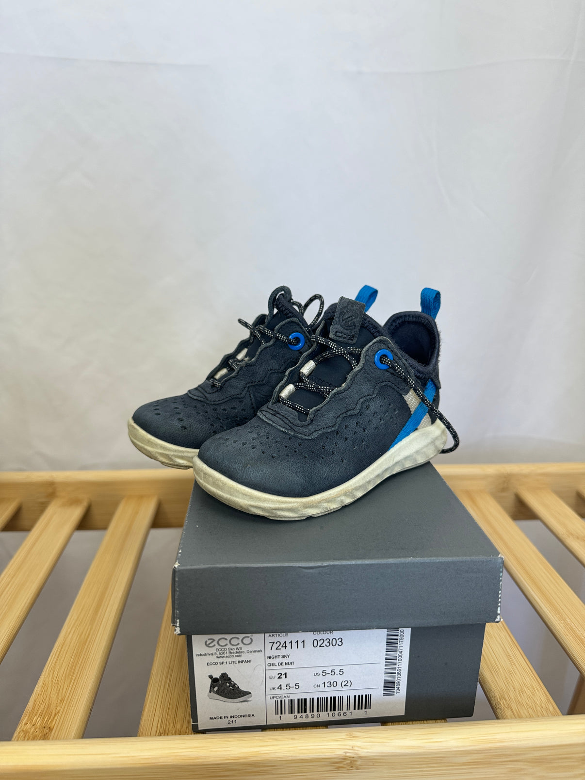Tmavě modré kožené tenisky ECCO ve velikosti 21, model ECCO SP1 Lite Infant. Boty jsou lehké, pohodlné a mají jednoduchý šněrovací systém pro snadné nazouvání a dobré upevnění nožičky. Ideální pro aktivní děti, které potřebují boty, které jsou odolné a zároveň pohodlné na každodenní nošení.