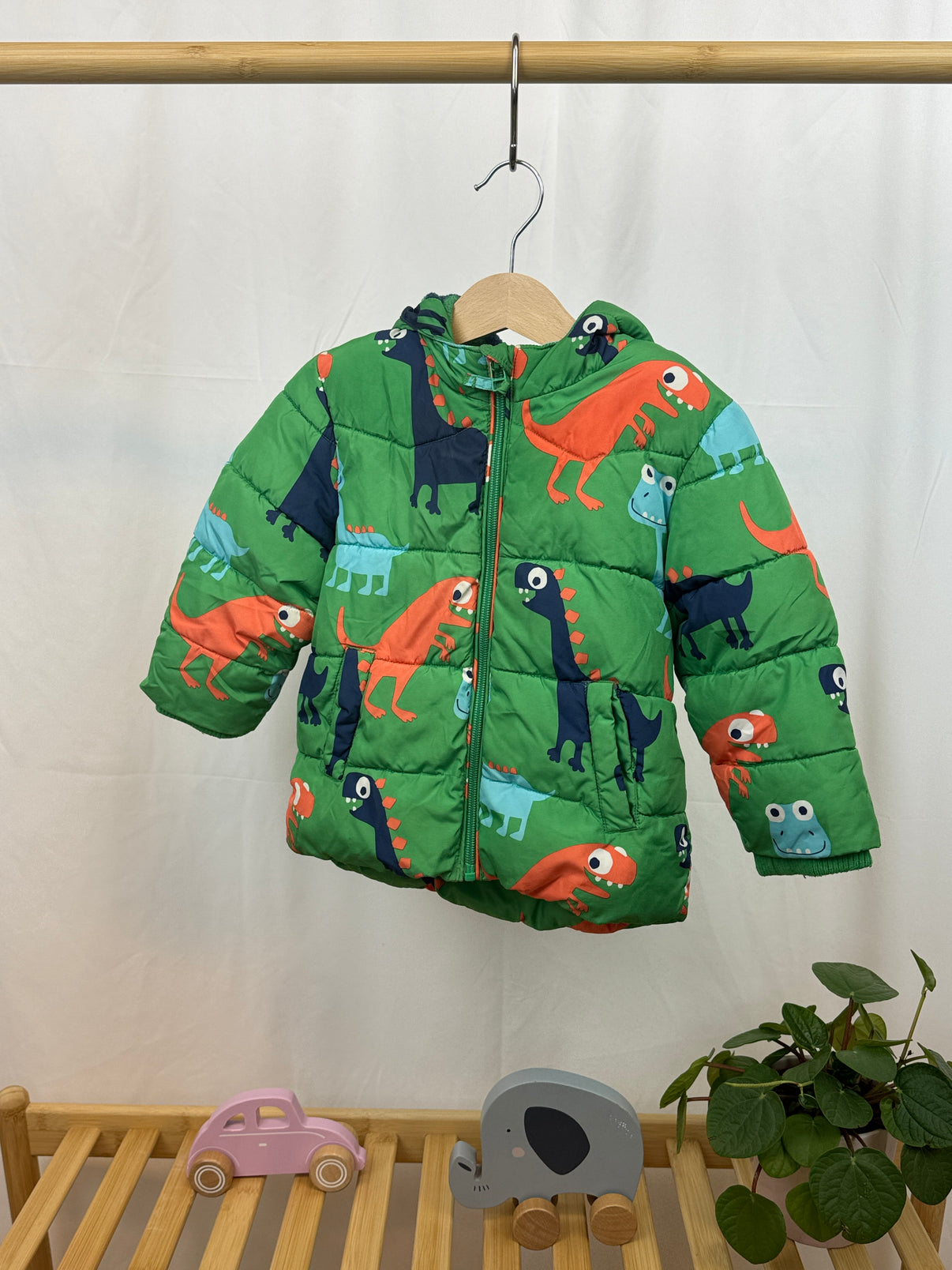Prošívaná bunda s fleecovou podšívkou Next velikosti 86. Zelená bunda s veselým dinosauřím potiskem v jasných barvách jako oranžová, modrá a tyrkysová, ideální pro malé objevitele. Teplá a pohodlná díky měkkému fleecu uvnitř, který zaručí příjemné nošení v chladnějším počasí. Praktické zapínání na zip usnadňuje oblékání.