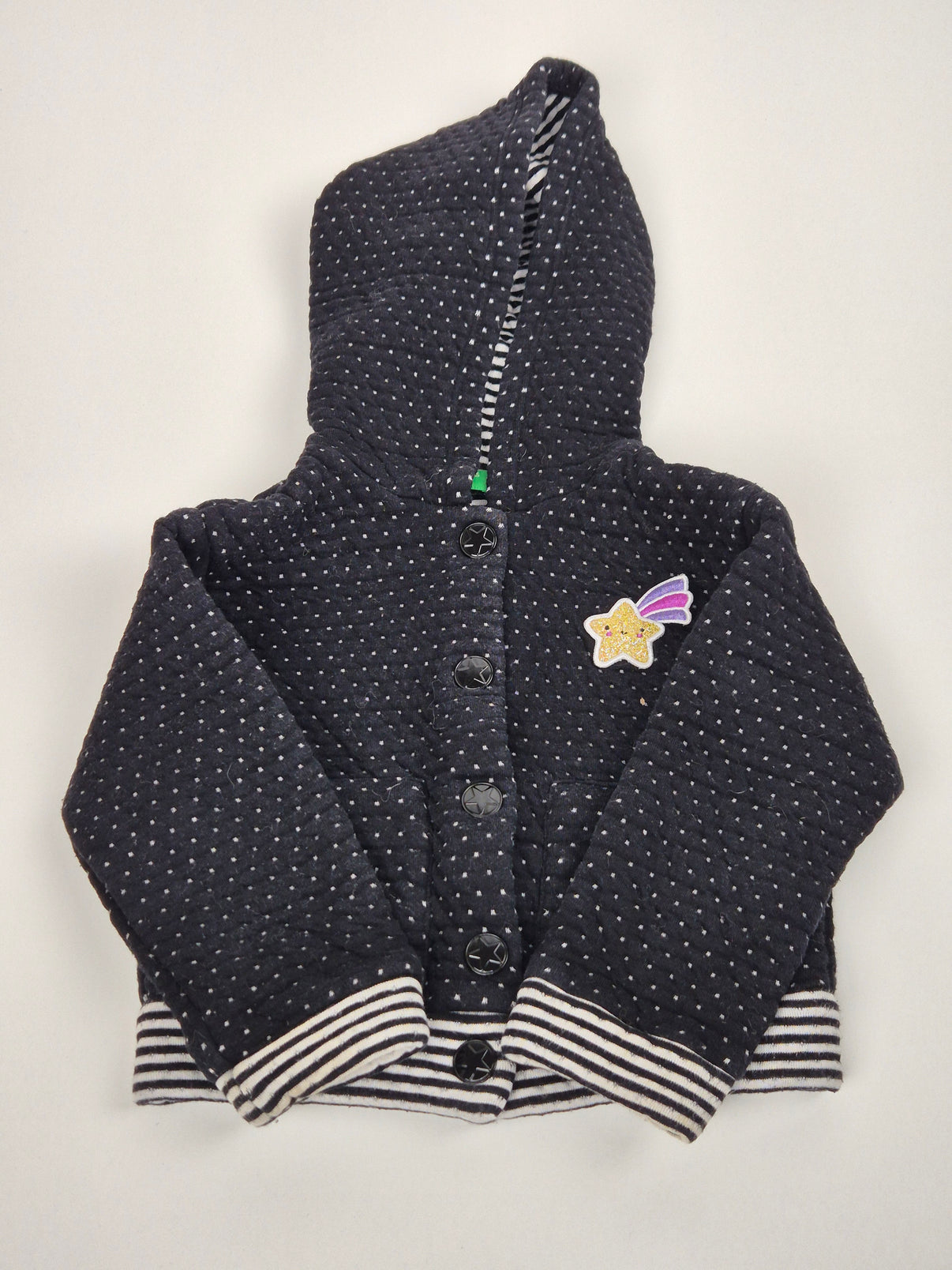 Bavlněná mikina s kapucí od United Colors of Benetton je ideální volbou pro chladnější dny. Tmavě modrý základ s drobným bílým puntíkem působí jemně a stylově, zatímco proužkované lemy a podšívka kapuce dodávají hravý detail. Na přední straně nechybí ani roztomilá aplikace padající hvězdy. Skvělá volba pro holčičku na každodenní nošení i do školky.