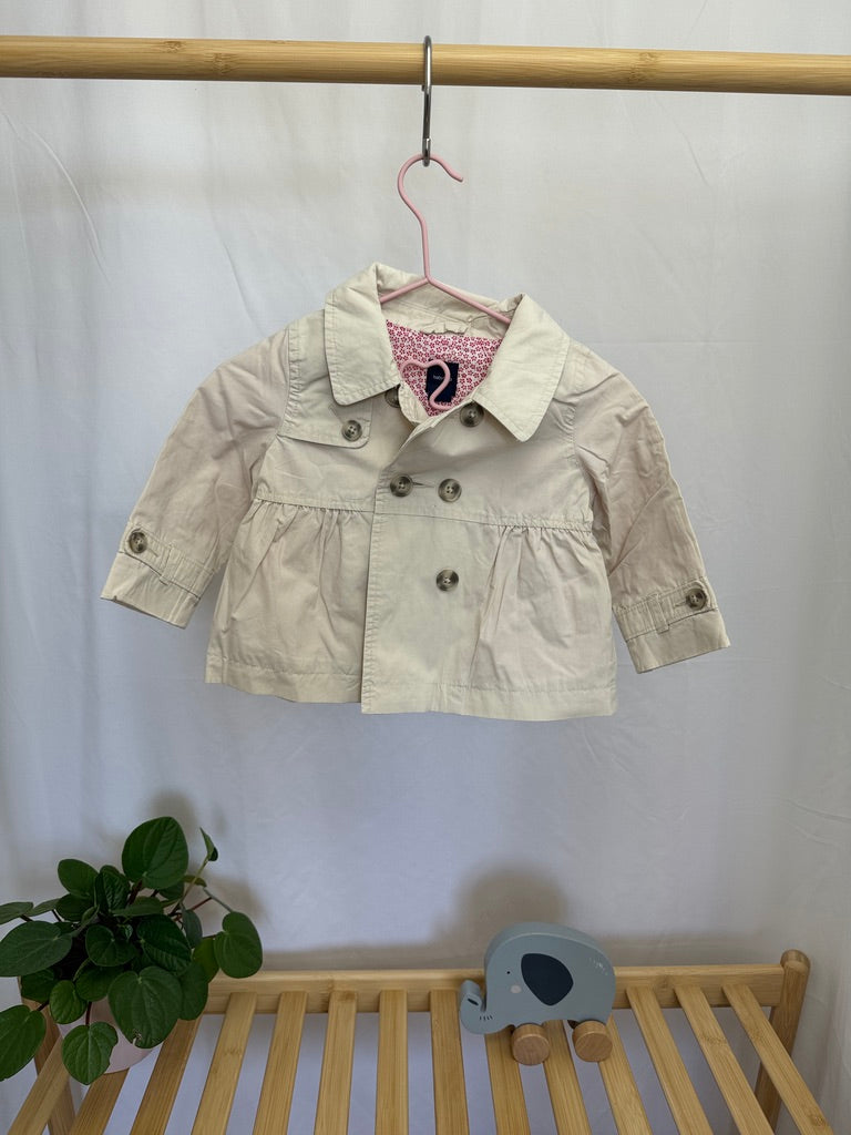 Krémový trenčkot GAP ve velikosti 74/80 je ideální volbou pro stylové malé princezny. Trenčkot má klasický dvouřadý zapínací design s límečkem a dlouhými rukávy. Krásně zdobený vnitřek s květinovým vzorem dodává kabátku šmrnc. Skvěle se hodí na chladnější dny pro elegantní vzhled při každé příležitosti.