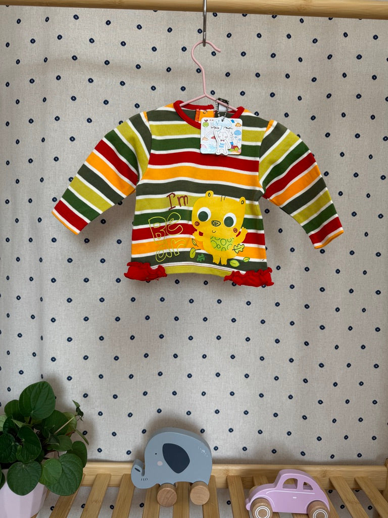 Toto pruhované triko s dlouhým rukávem od značky Tuc Tuc ve velikosti 68 je skvělou volbou pro malé děti, které milují hravé a barevné oblečení. Triko je vyrobeno z měkkého materiálu, který zajišťuje pohodlí a teplo během chladnějších dnů. Veselé pruhy v kombinaci s obrázkem žlutého zvířátka na přední straně přináší radost a úsměv do každodenního života vašeho dítěte. Detailní červené volánky na spodním lemu dodávají triku roztomilý vzhled. Praktické zapínání na zadní straně umožňuje snadné oblékání a svlékání. Ideální kousek pro každodenní nošení, který zaručí, že vaše malé děťátko bude vypadat stylově a cítit se pohodlně.