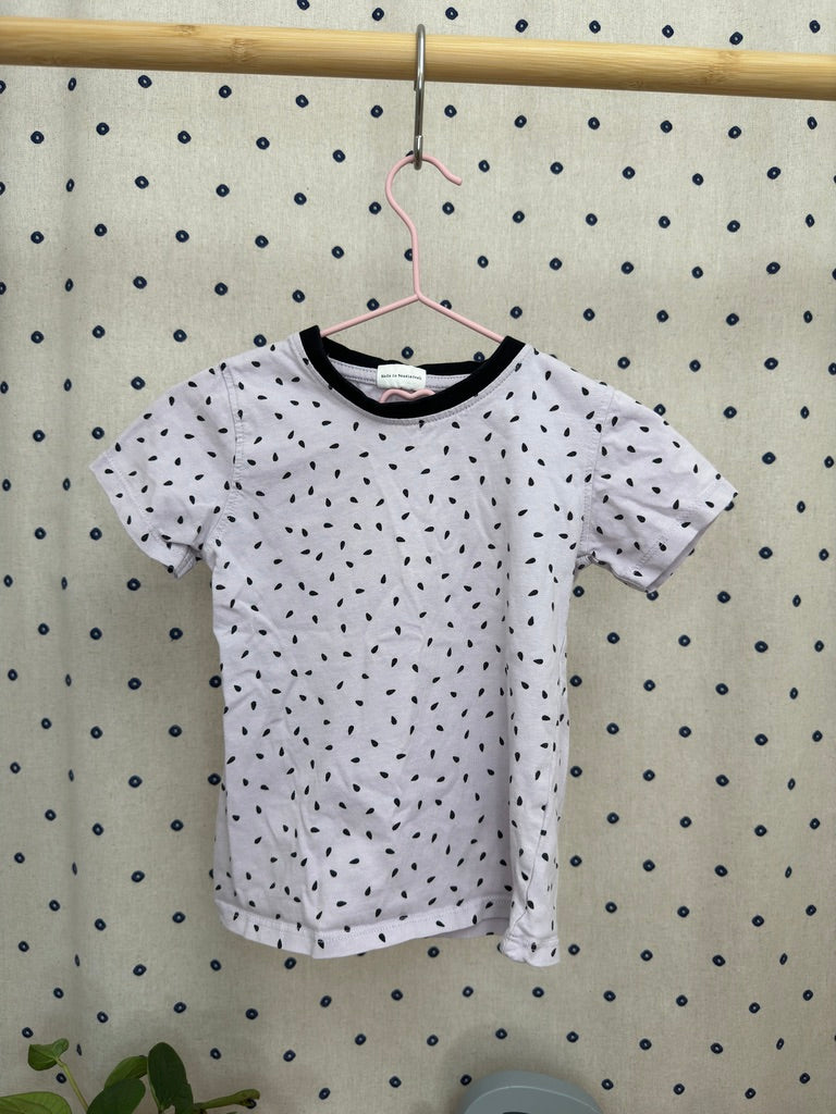 Stylové tričko s krátkým rukávem od značky Turtledove London ve velikosti 98. Bílý základ s černými puntíky dodává tričku moderní a minimalistický vzhled, ideální pro každodenní nošení. Černý lem kolem krku přidává šmrnc a dělá z tohoto kousku univerzální volbu pro malé holčičky. Perfektní na léto či do školky.
