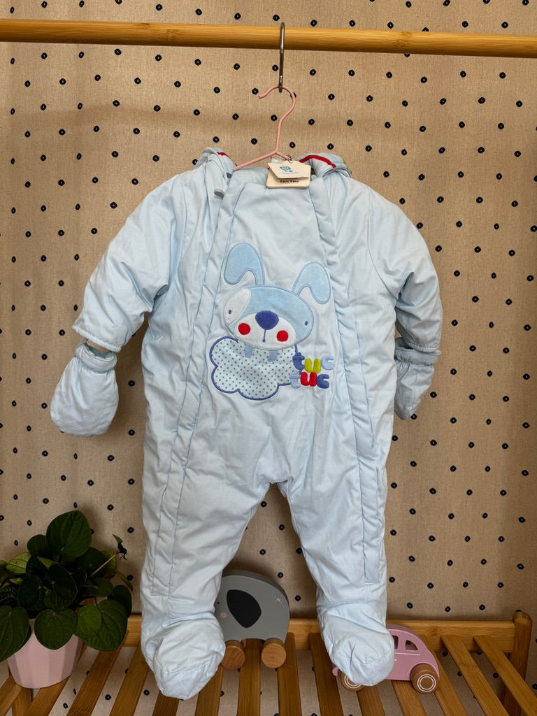 Zimní kombinéza v jemně modré barvě s roztomilým motivem pejska na přední straně je ideální volbou pro chladné dny. Kombinéza je vybavena kapucí s malými oušky a rukavičkami, které chrání před mrazem. Tento kousek je od značky Tuc Tuc, známé svým hravým designem a kvalitními materiály. Zapínání na zip zajišťuje snadné oblékání a pohodlí pro vaše miminko ve věku 6-9 měsíců.