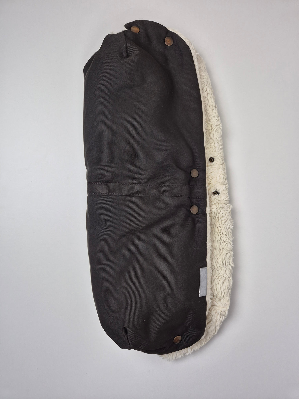 Elegantní a velmi hřejivý rukávník na kočárek v tmavě hnědé až černé barvě s vnitřní stranou z jemného krémového beránka. Kombinace odolného vnějšího materiálu a extra měkkého, huňatého vnitřku zajistí maximální komfort rukou i v opravdu chladném počasí.