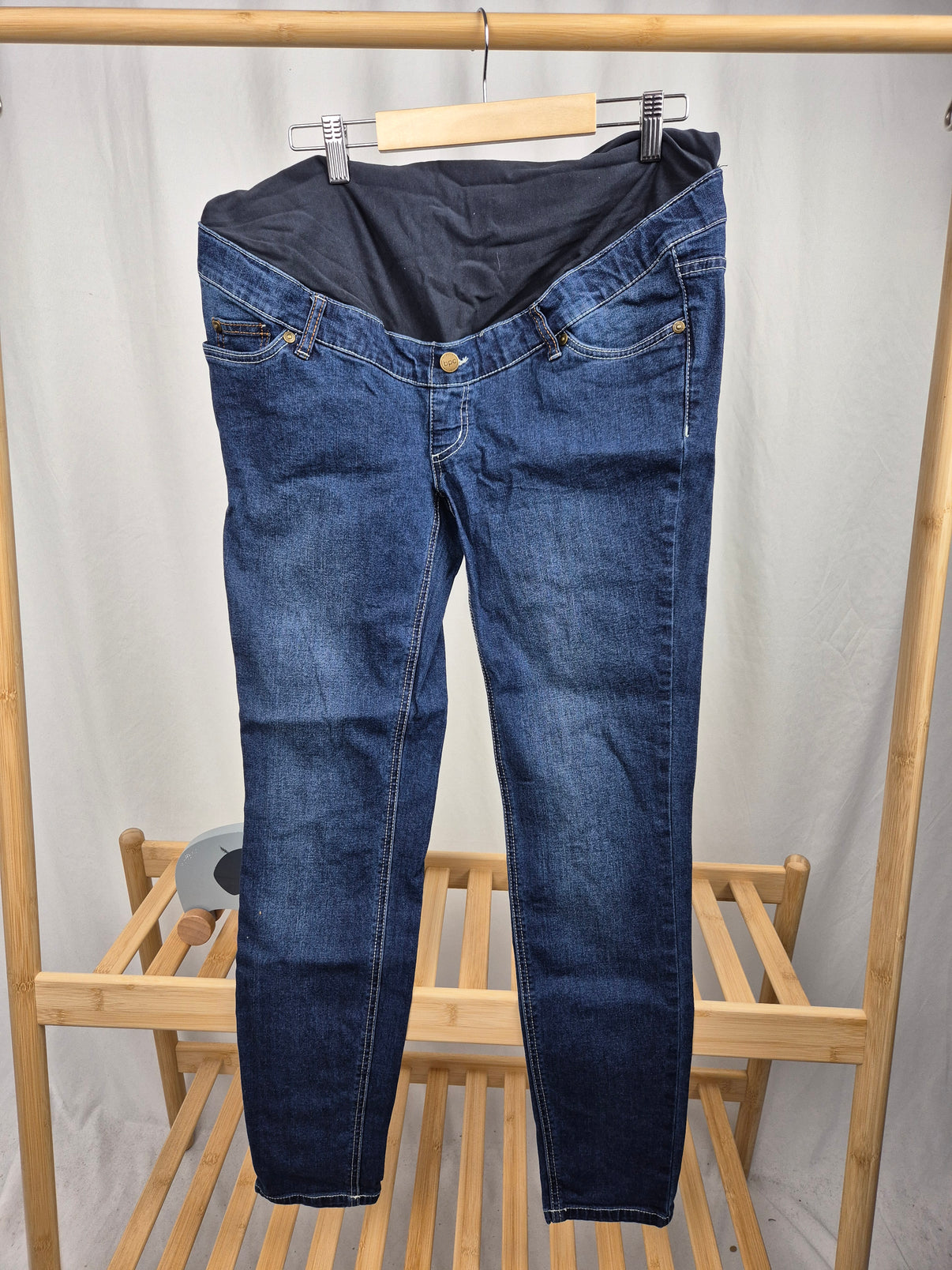 Těhotenské džíny značky Bonprix ve velikosti 42 s elastickým pásem přes bříško. Klasický modrý denim v užším střihu se skvěle kombinuje s tričky i halenkami a poskytuje pohodlí po celé těhotenství.