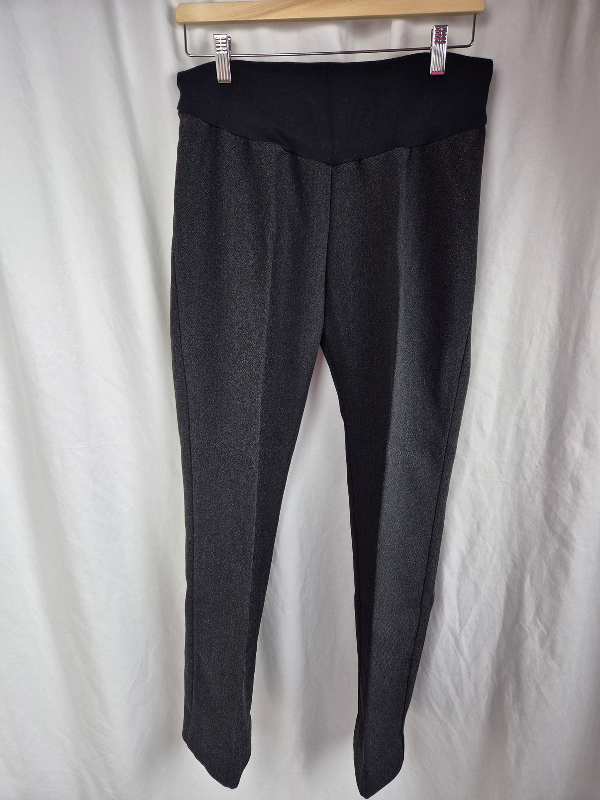 Elegantní těhotenské kalhoty v tmavě šedém melíru s černým těhotenským pasem, který je měkký, pružný a pohodlně se přizpůsobí rostoucímu bříšku. Materiál působí uhlazeně, ale zároveň je příjemný na nošení, takže kalhoty zvládnou celý den bez nepohodlí.