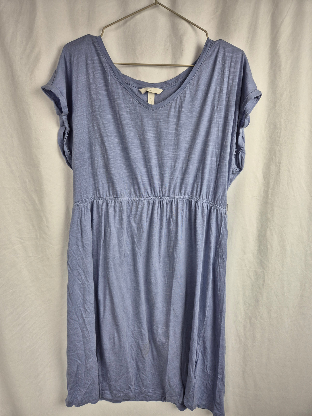 Světle modré těhotenské šaty značky H&M s krátkým rukávem a pohodlným střihem pod prsy, který se krásně přizpůsobí rostoucímu bříšku. Lehký a vzdušný materiál zajišťuje komfort během celého dne, ideální na léto i volnočasové nošení.