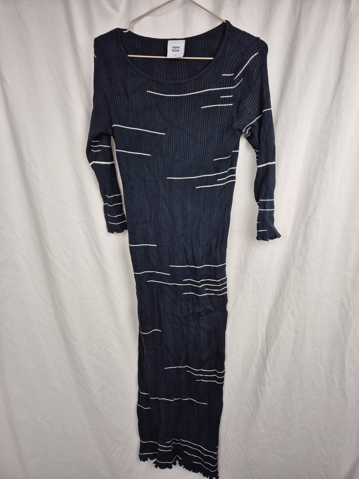 Elegantní těhotenské šaty Mamalicious ve velikosti M v tmavě modrém žebrovaném provedení se subtilními bílými linkami. Díky elastickému materiálu krásně obepnou rostoucí bříško a zároveň zůstávají pohodlné po celý den. Dlouhý střih společně s jemným zvlněným zakončením rukávů i spodního lemu působí žensky a lichotivě. Skvělé na běžné nošení, do práce i na příjemnější příležitosti – univerzální kousek do těhotenského šatníku.