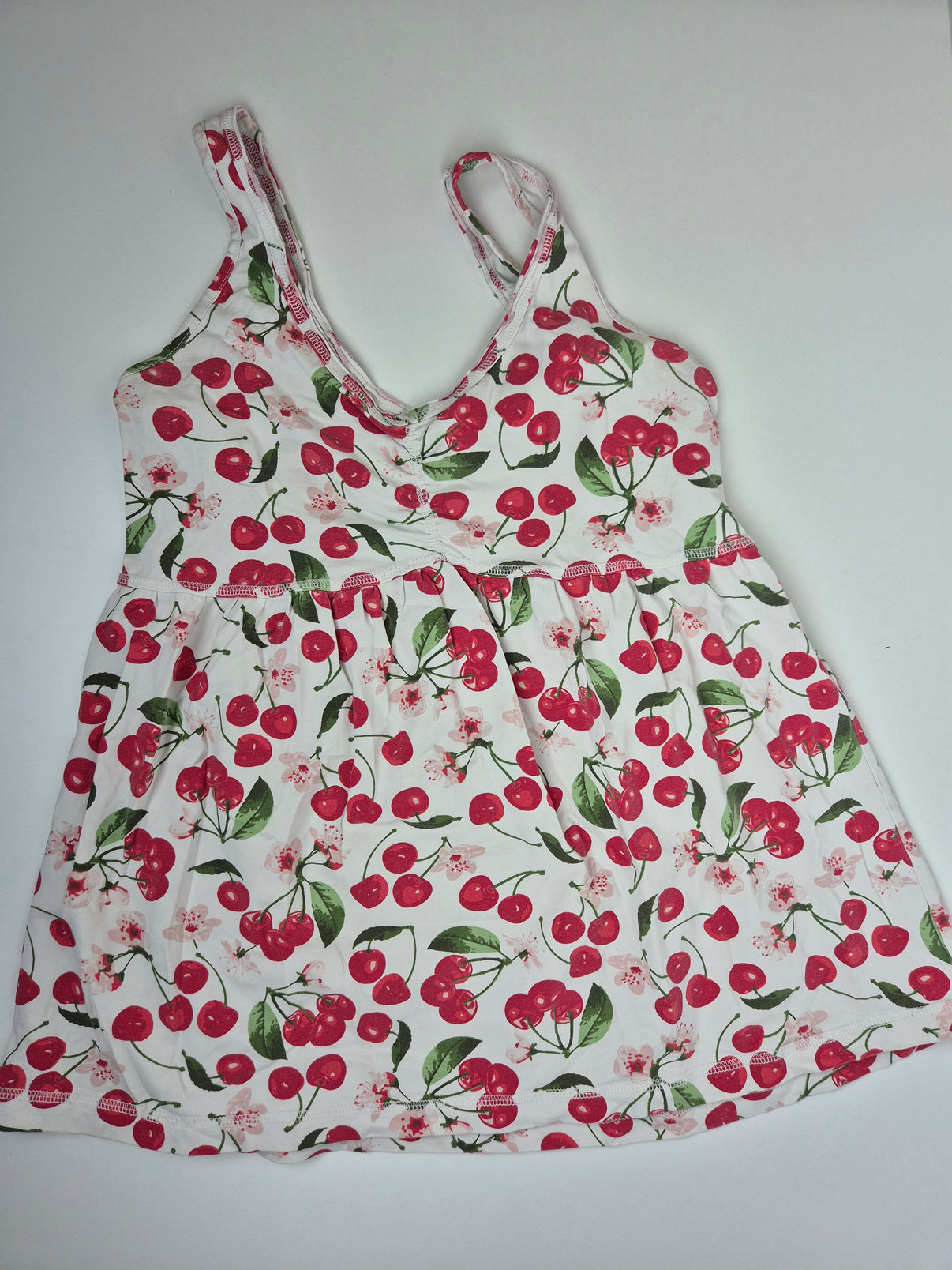 Lehké a pohodlné těhotenské tílko s jemným letním vzorem třešní. Základ v čistě bílé barvě doplňuje výrazný červený potisk s třešněmi a zelenými lístky, který působí svěže a hravě. Střih je přizpůsobený rostoucímu bříšku, ramínka jsou širší a dobře drží, takže tílko je ideální na běžné nošení doma, na procházky i do teplejších dnů. Příjemný materiál zajistí komfort po celý den.